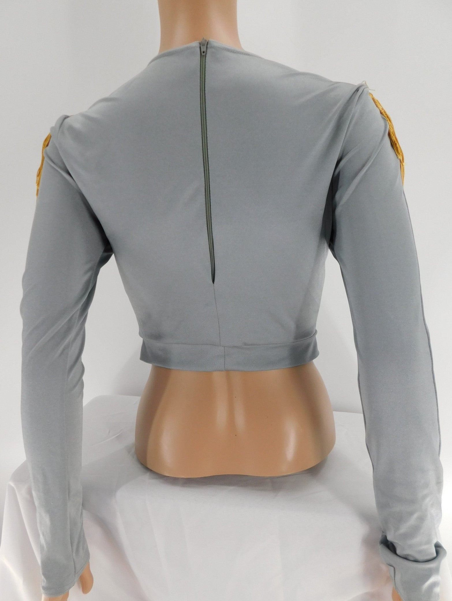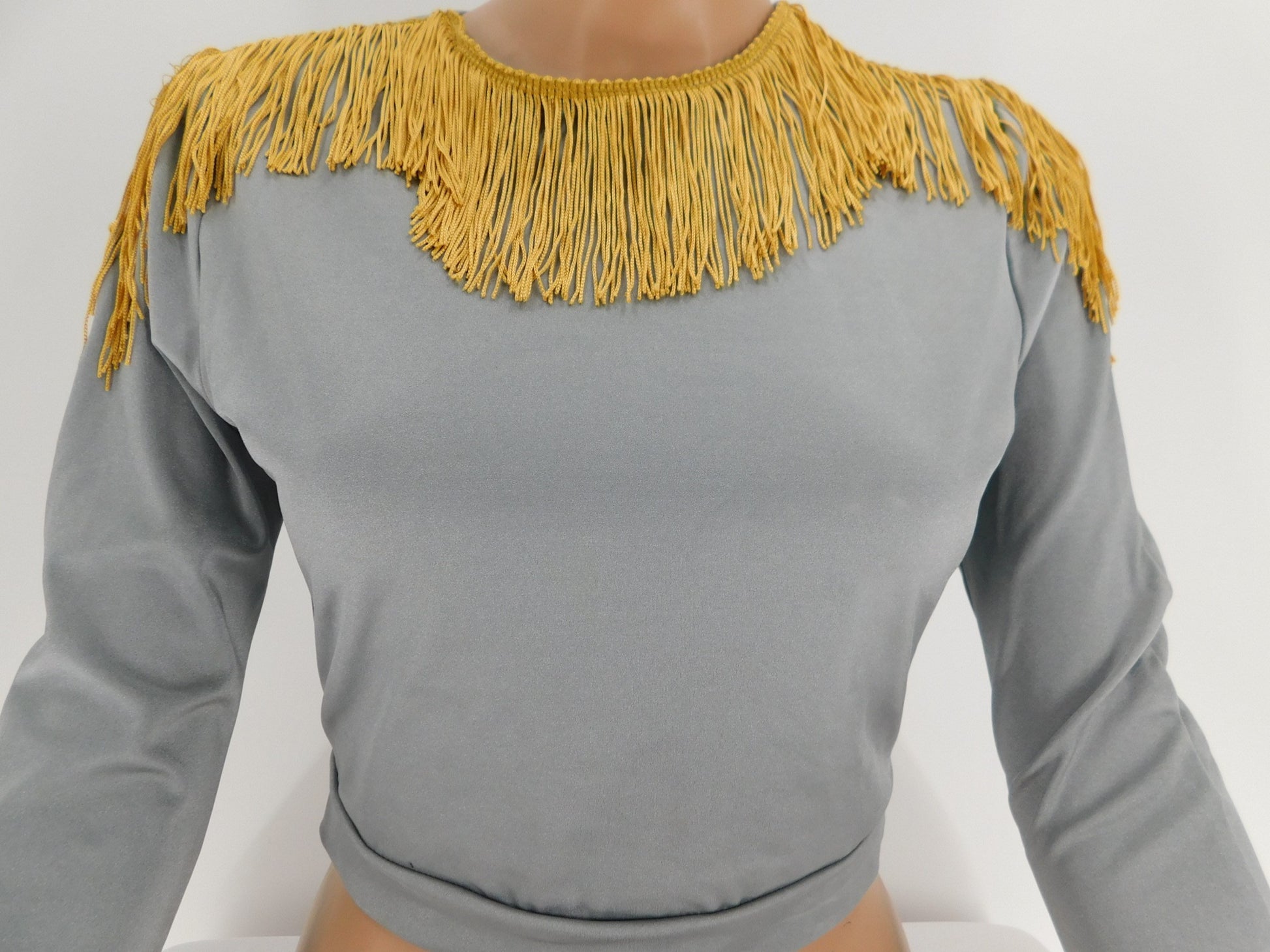 Long sleeve crop top with fringe along collar and sleeves. Top zips up in the back. DOES NOT include shorts or briefs!