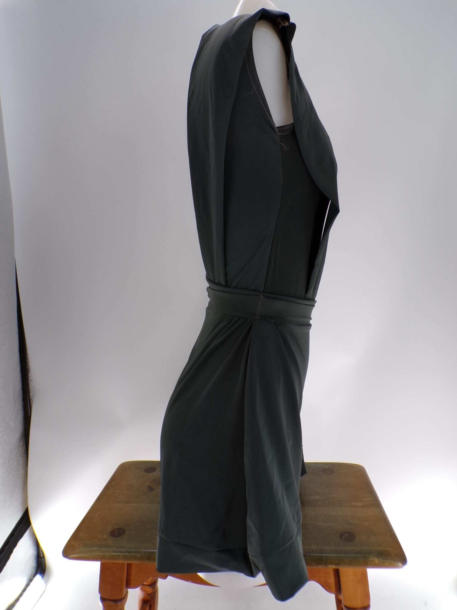2 piece costume includes spandex halter leotard with mesh overlay and draping over the shoulders, shorts to match.