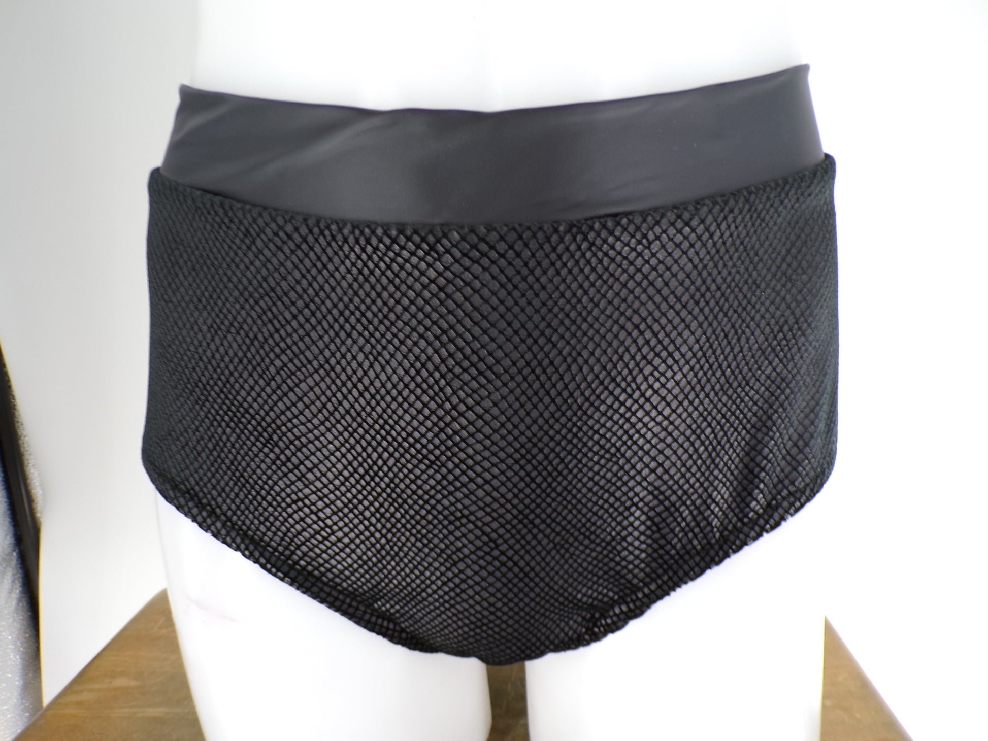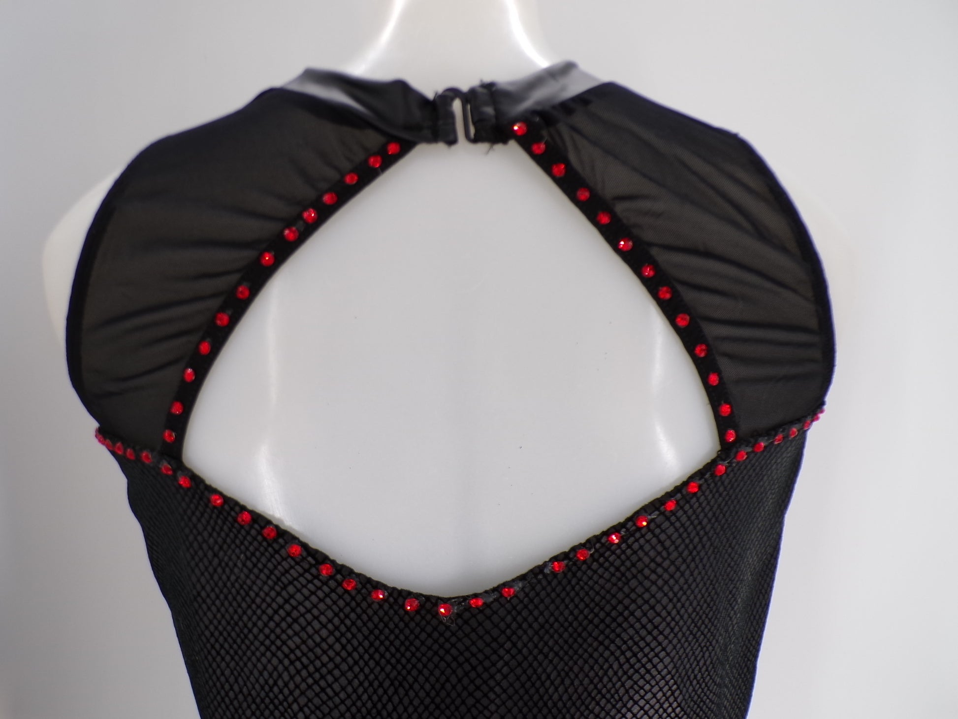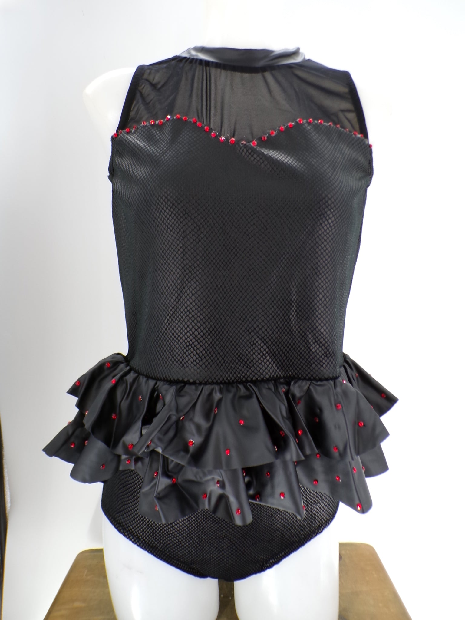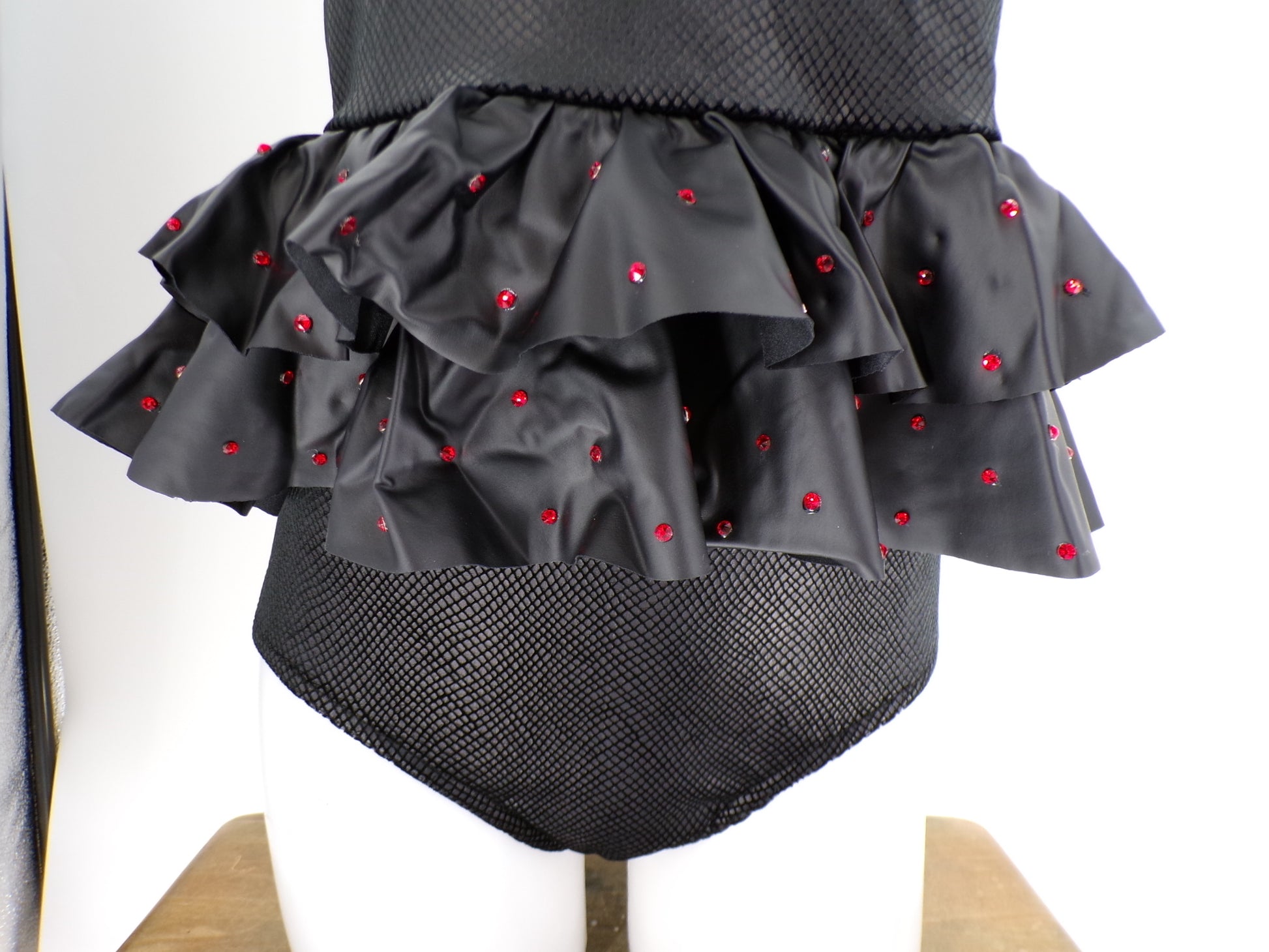 2 pc costume includes pleather and velvet peplum top with mesh neckline and matching high waisted briefs. Rhinestones have been added for extra flair.