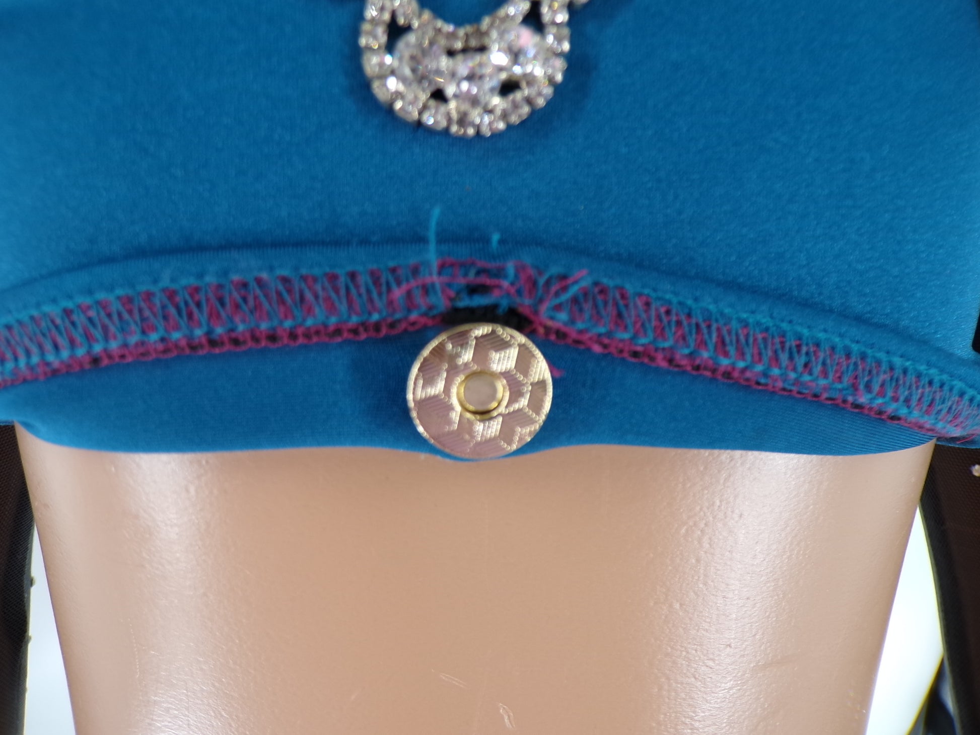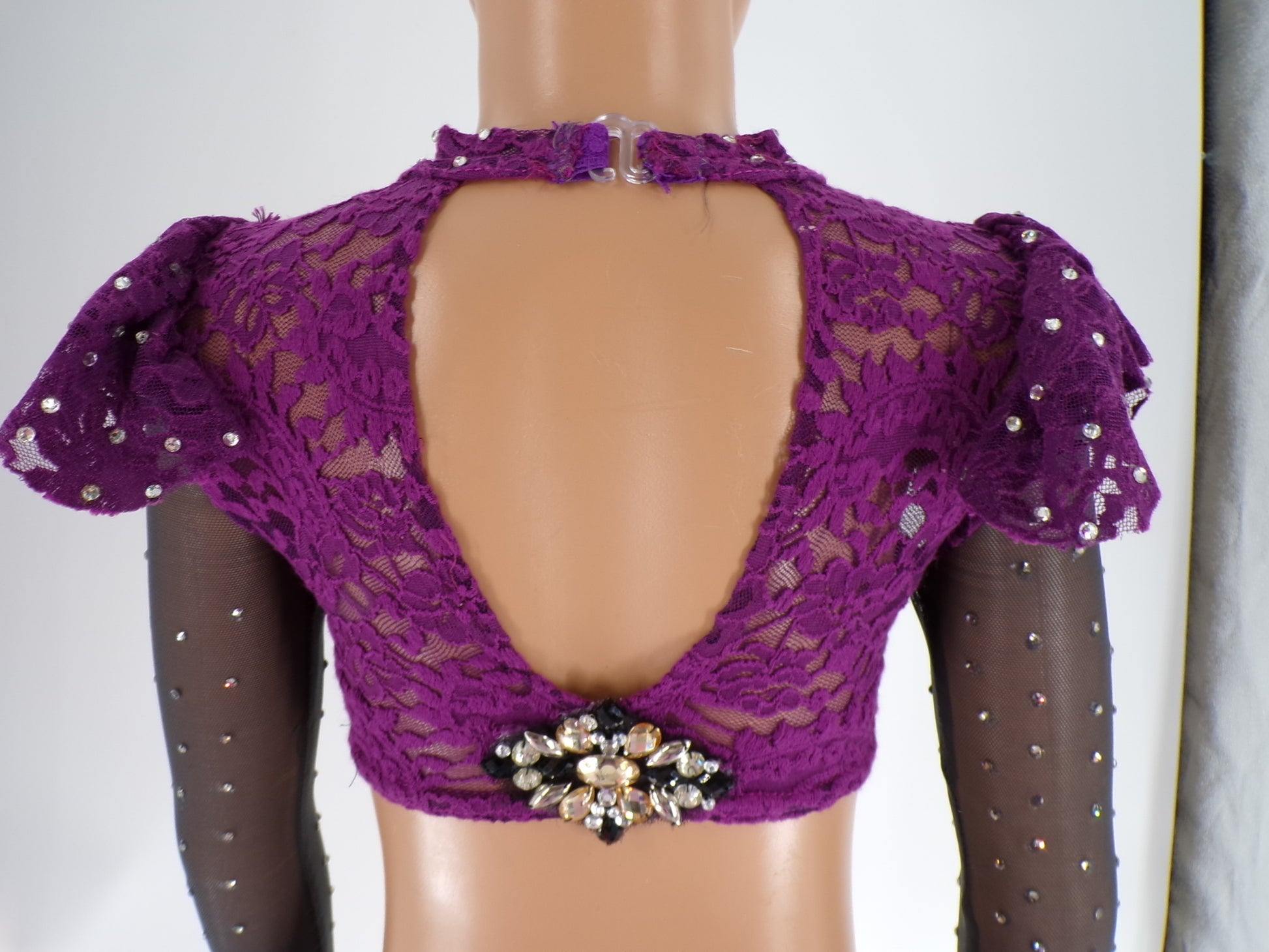 2 pc costume is attached at mid drift with fabric strips and rhinestoned buckles. Long sleeved crop top has mesh sleeves and lace ruffles with rhinestones scattered about and applique attached to the middle. Bottoms are matching in material with lace skirting and bejeweled embellishment at the waist.