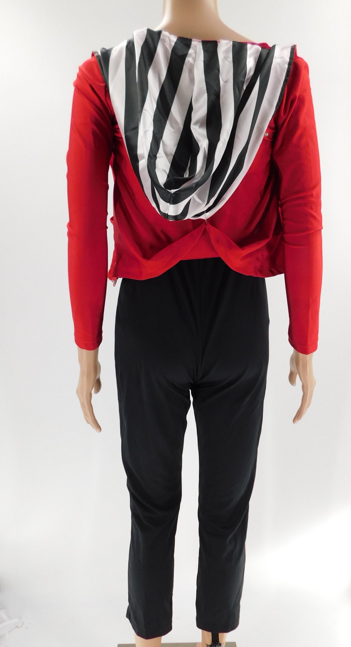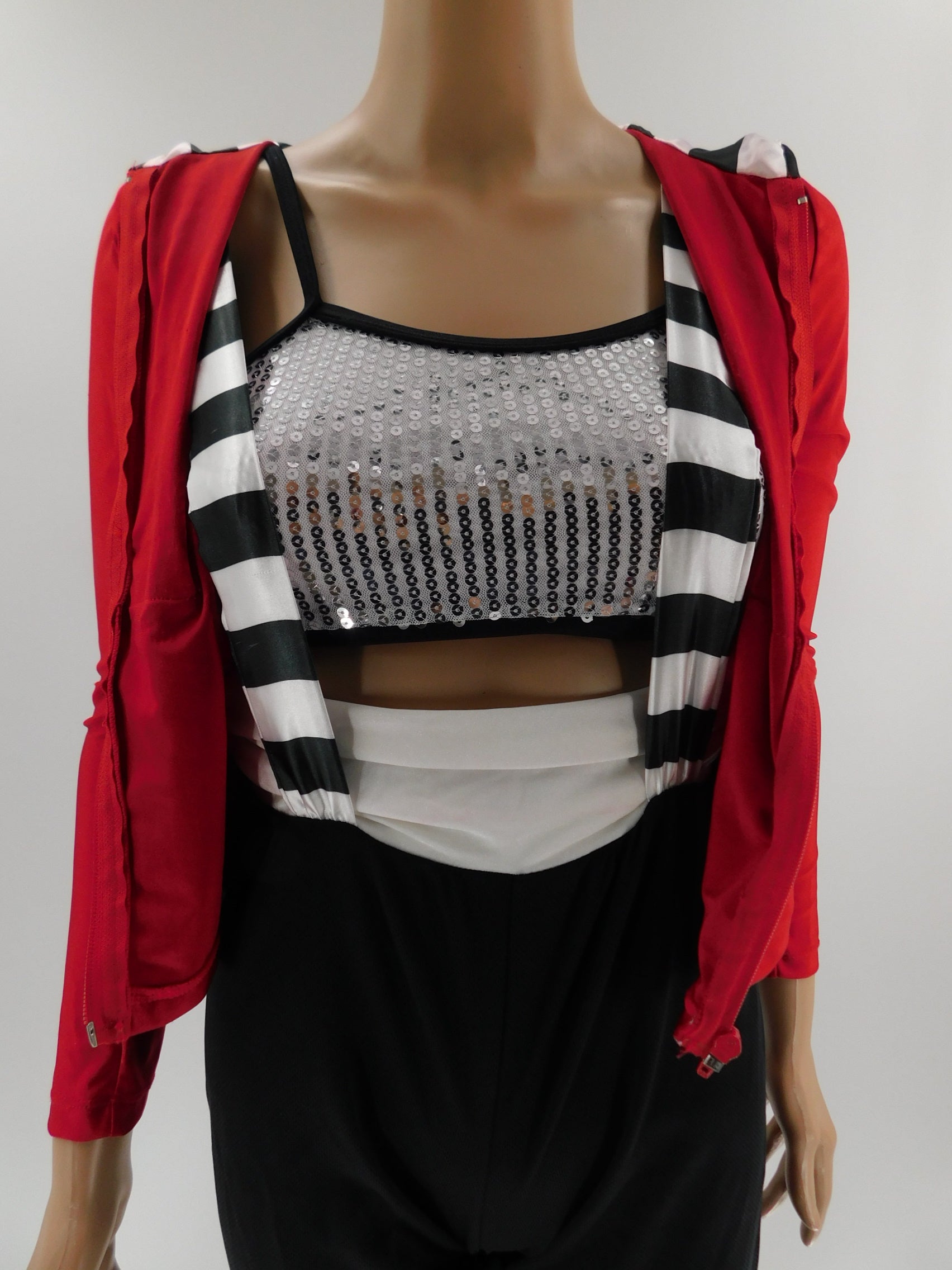 3 piece costume that includes hooded jacket, sequined cropped bralette, and stretch pants with attached suspenders.