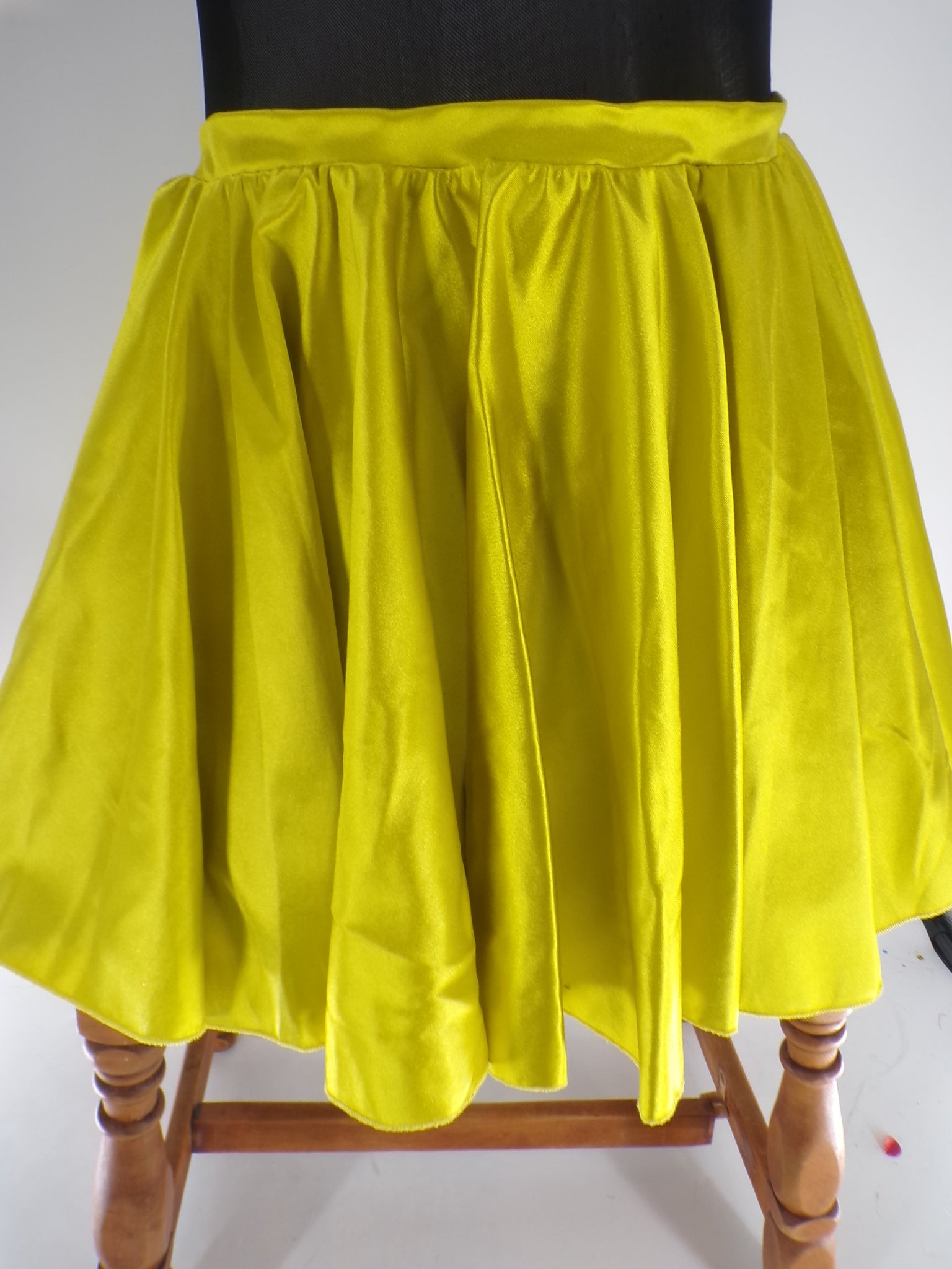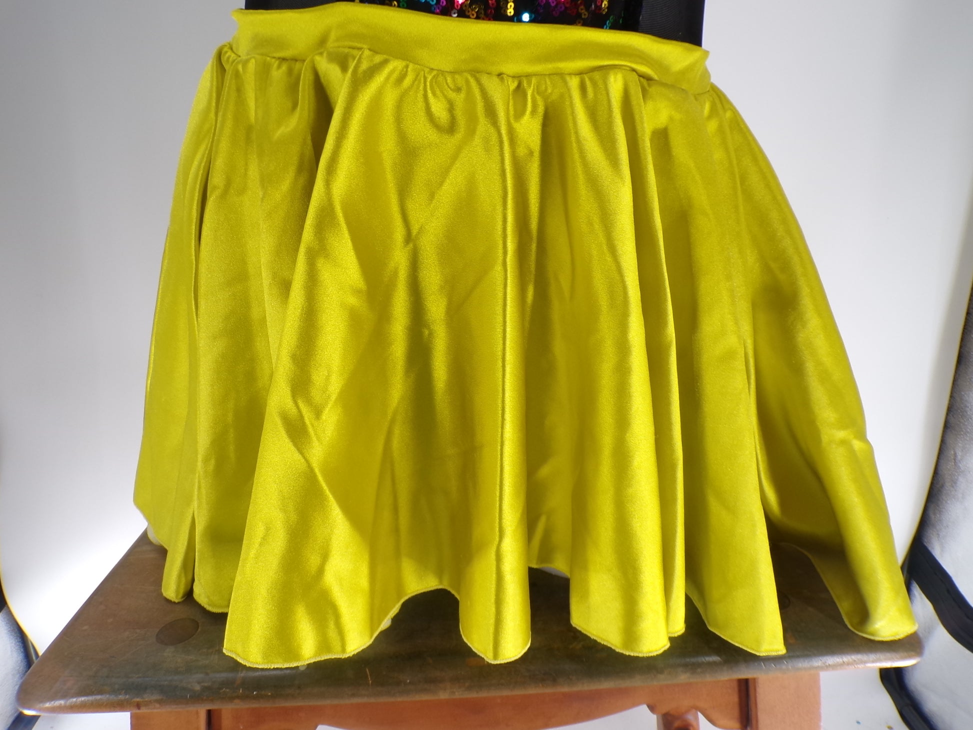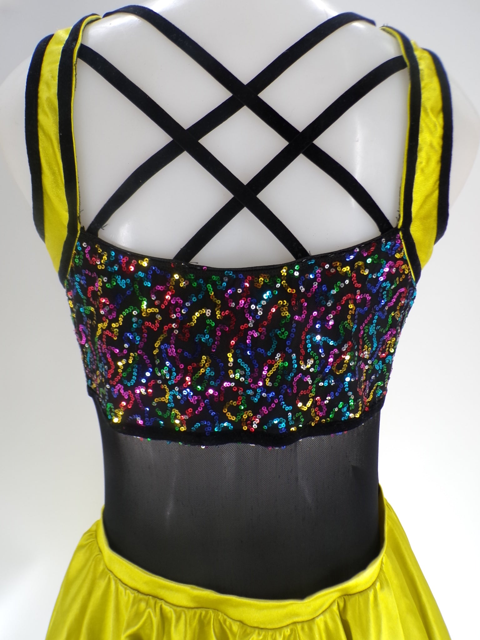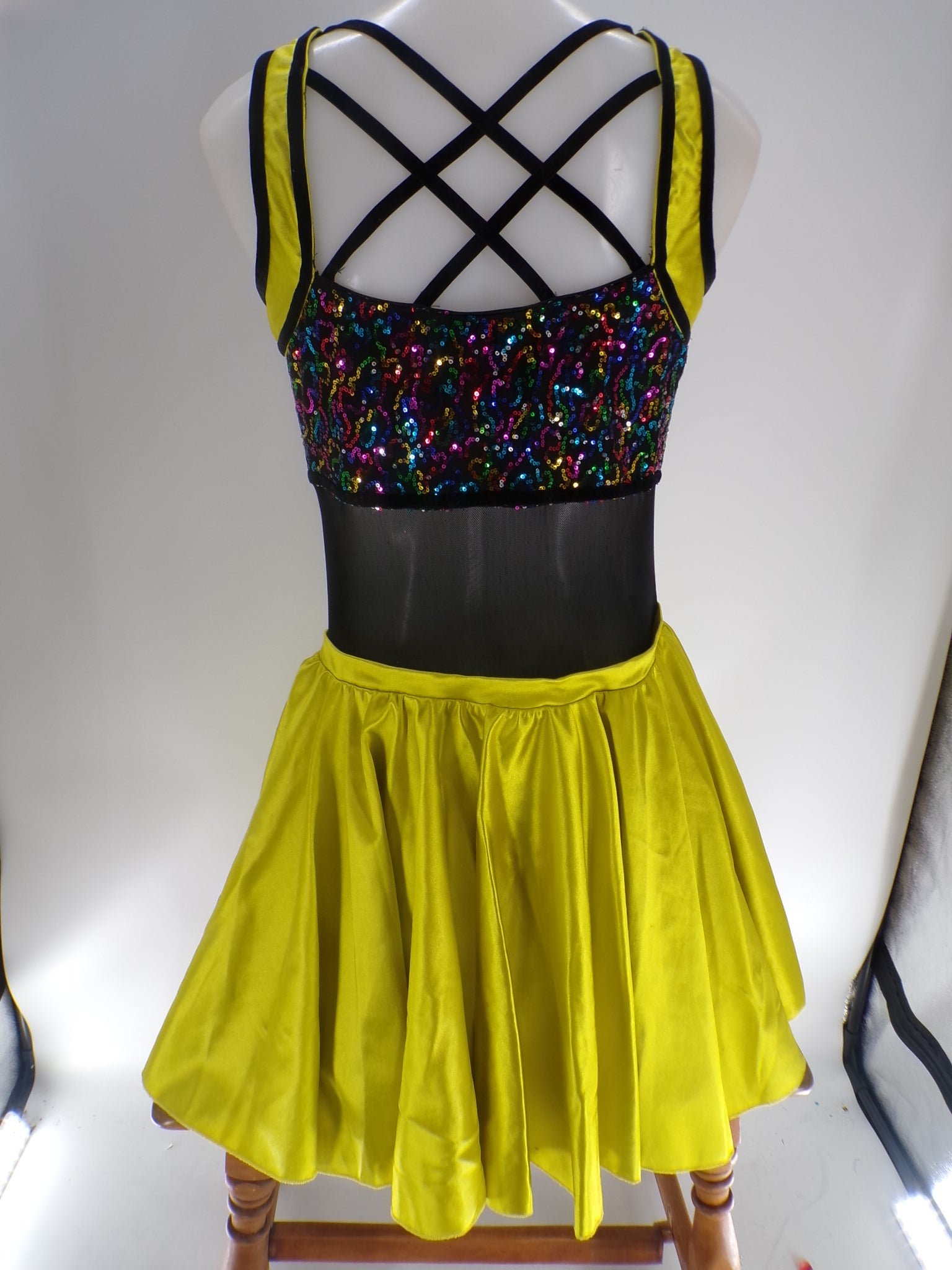 Leotard with mesh mid drift. Attached skirt with velvet trimming and sequined bodice. Flower headpiece included.