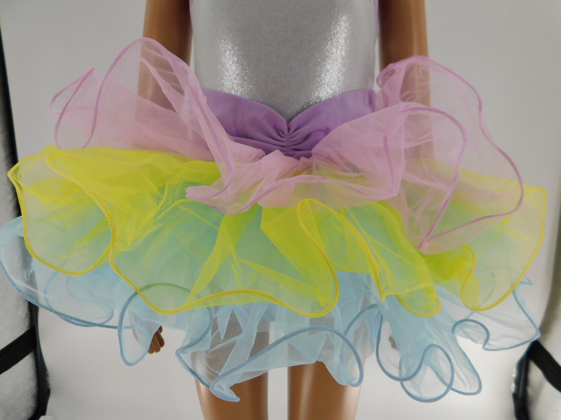 Metallic leotard with attached layered tulle tutu. Includes matching hair bow.