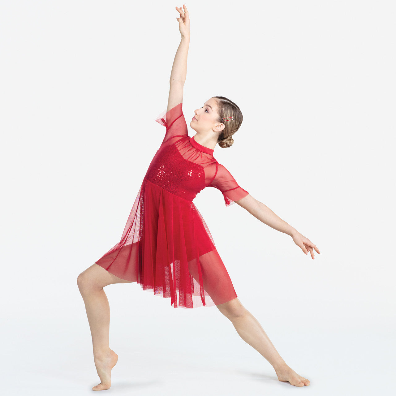 Biketard with top-lined sequin spandex bodice and matte spandex extended bike-shorts leg line has attached adjustable nude shoulder straps for added support, spandex neckline with hook closure, and attached mesh sleeves and overlay with empire skirt.