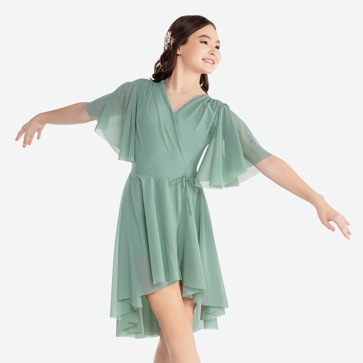 Features: Solid Flutter Sleeves Flowy Trunks Spandex