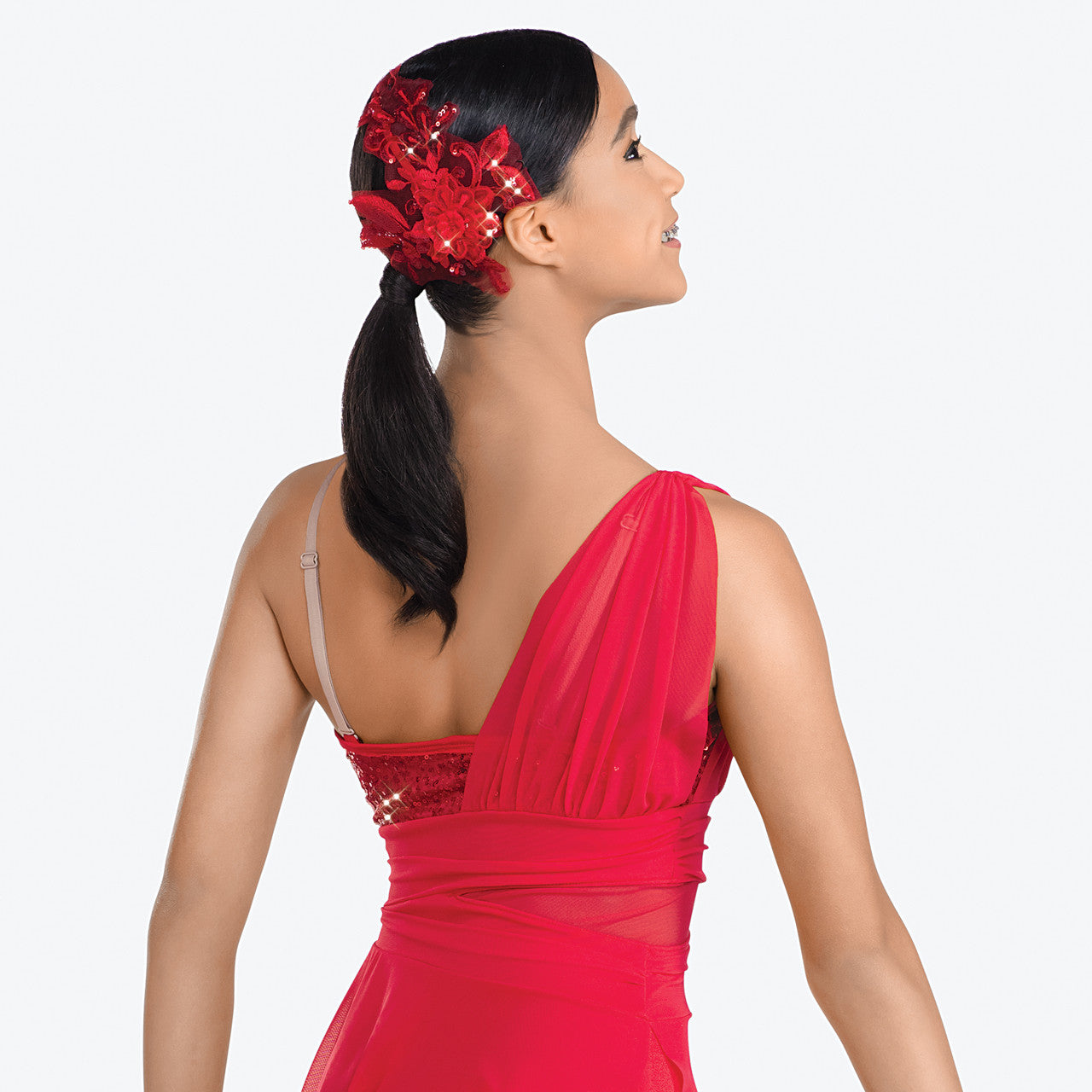 Attached asymmetrical mesh skirt with a slit for ease of movement