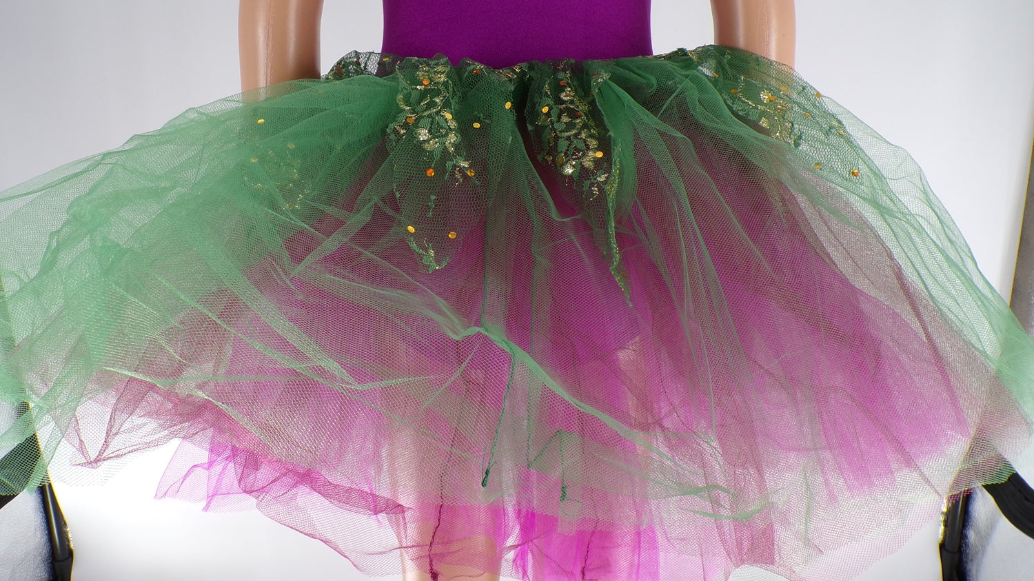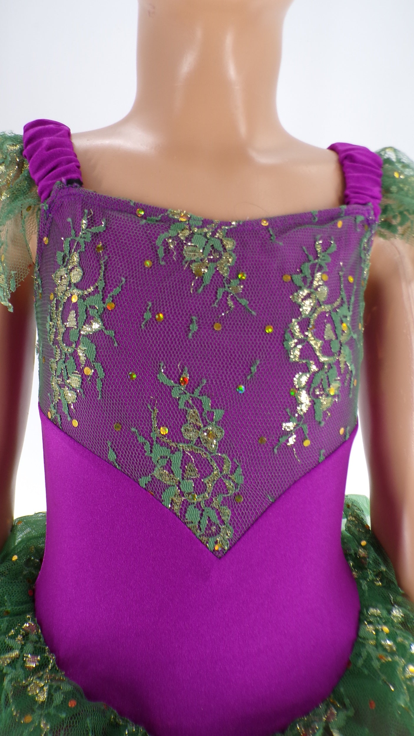 Spandex leotard with attached tulle tutu and glitter lace overlay.The same matching glitter lace overlay on the shoulder and on the chest of the bodice.