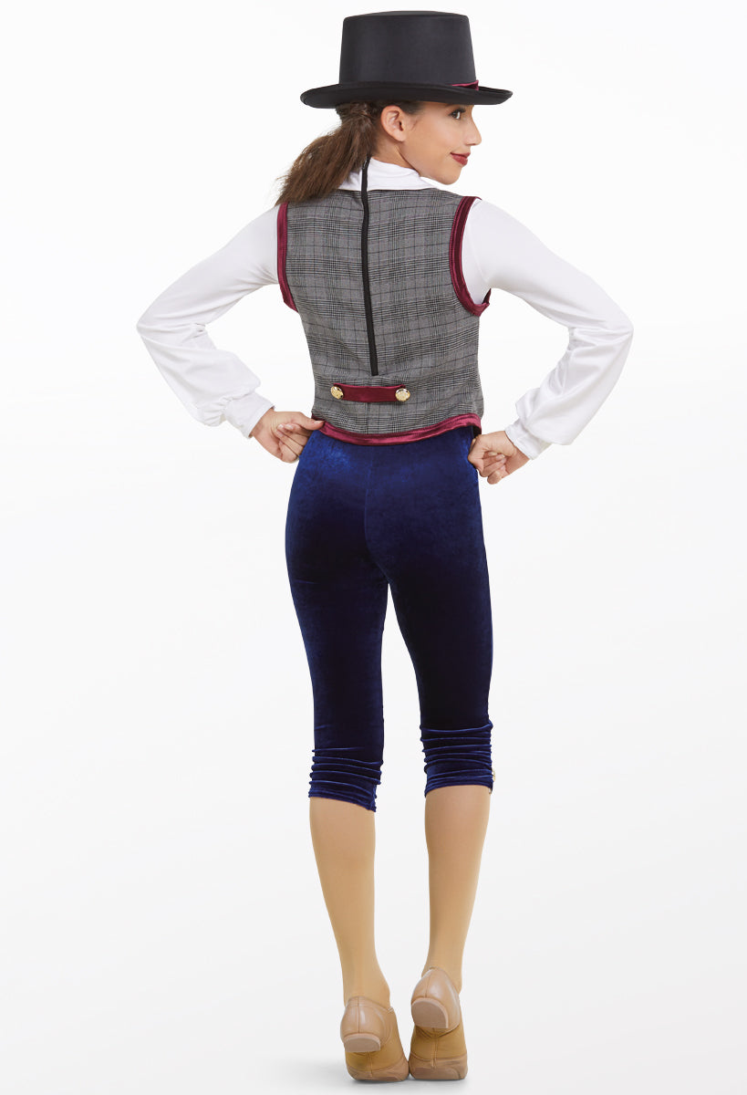?White Rabbit-inspired costume with plaid vest trimmed in satin over a shiny spandex long sleeve shirt
