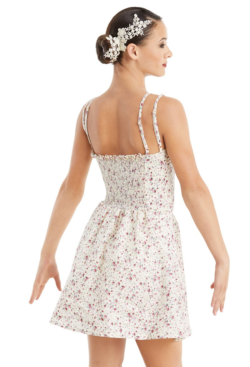 This dress features a floral print woven fabric with princess seams