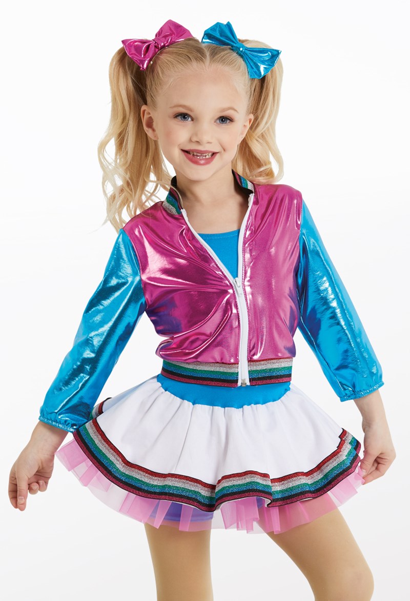 Two-tone jacket is made of metallic spandex with metallic rainbow elastic collar and hem