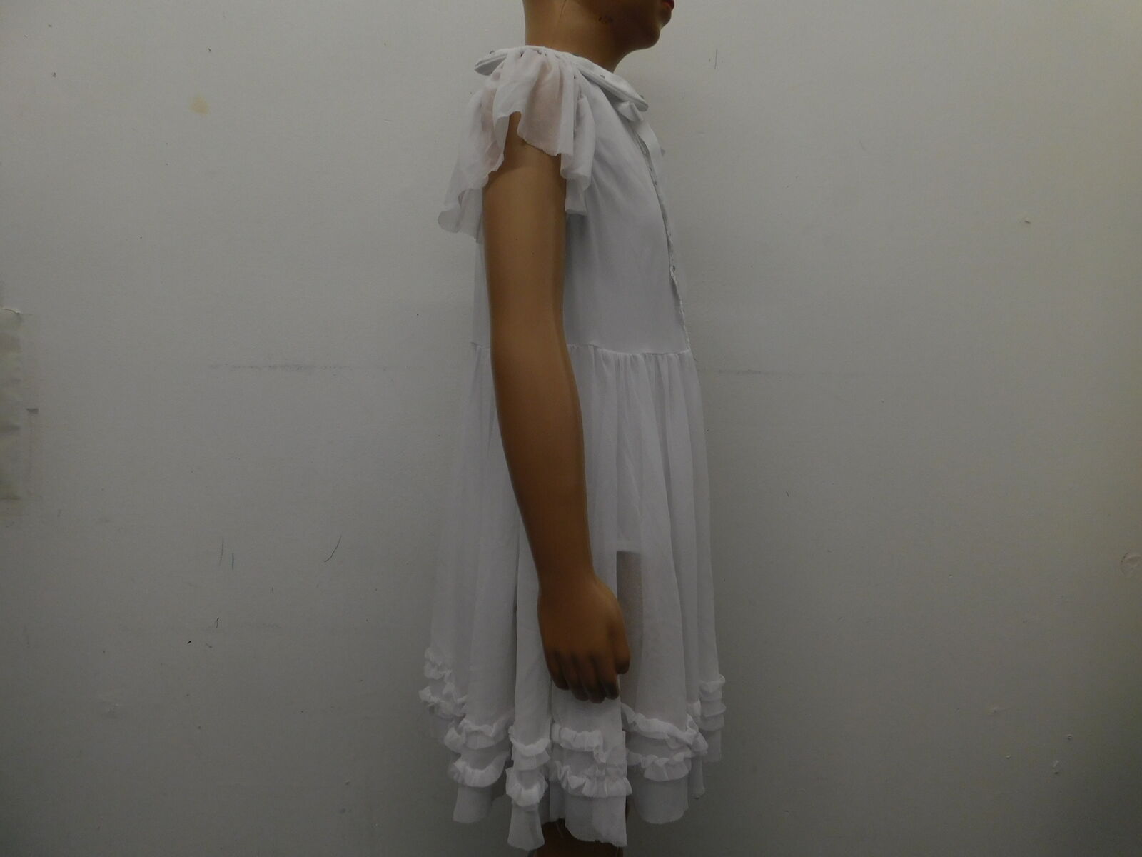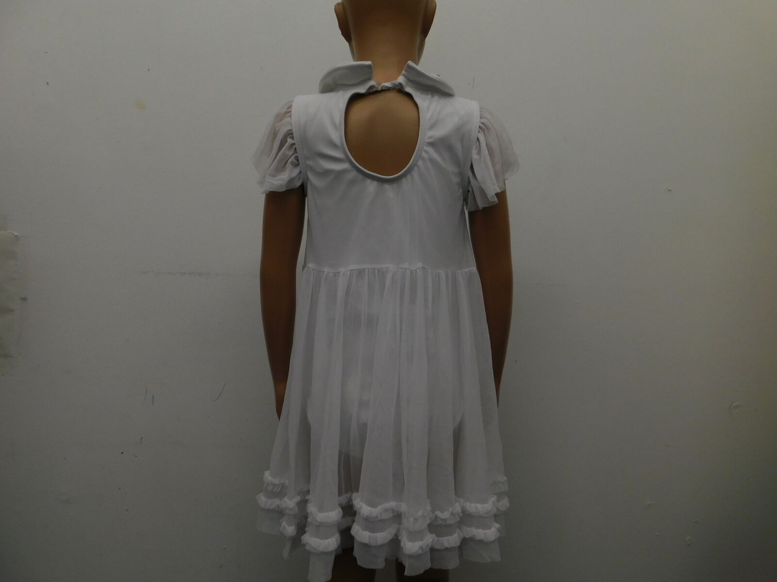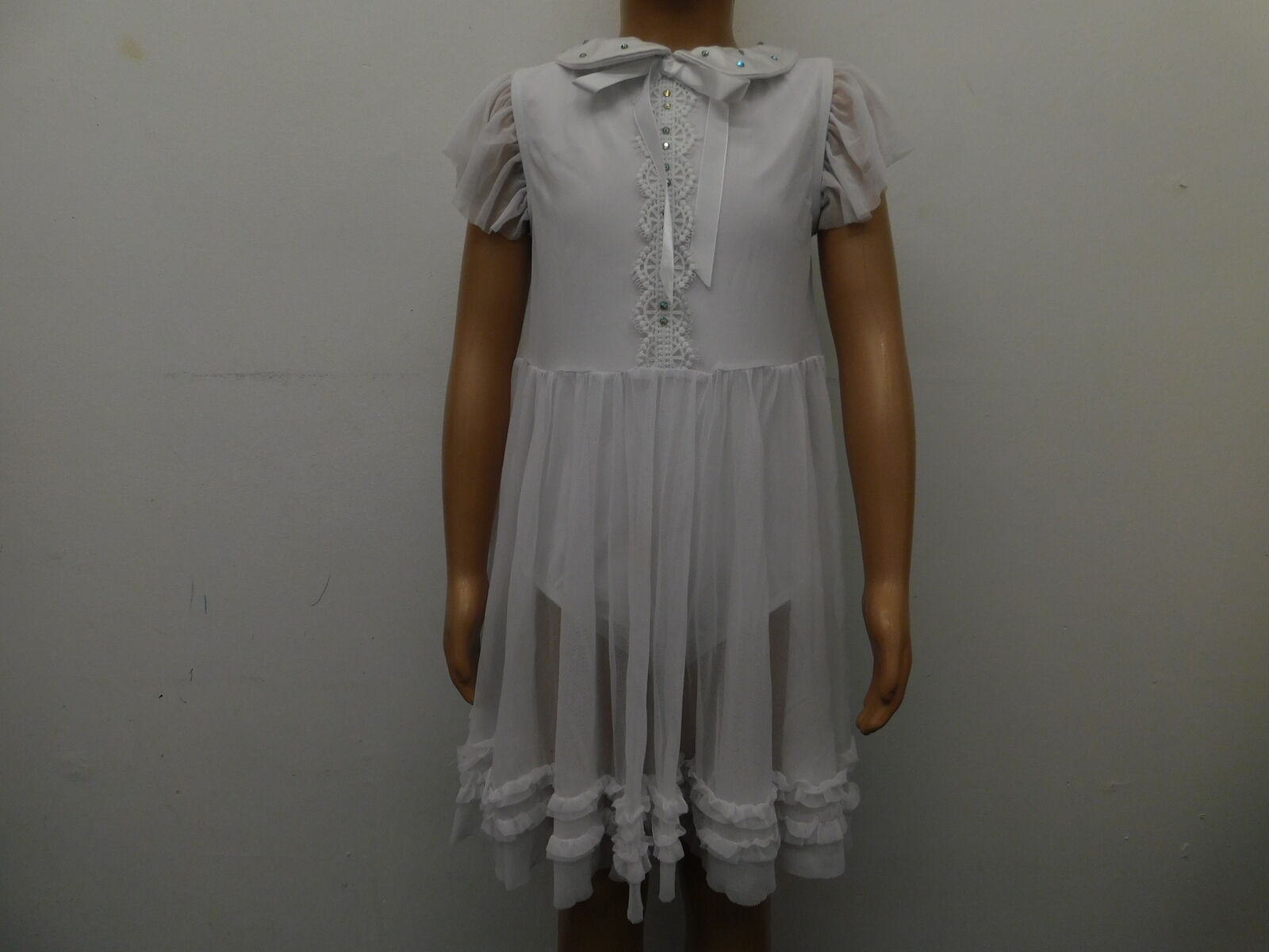 Cap sleeve dress has a shiny spandex bodice Oval lace trim down the front bodice Rounded collar with attached tie Flowing power mesh sleeves Keyhole opening in back with a G-hook closure Attached power mesh skirt with rows of mini ruffles Attached briefs Glitter free! Imported