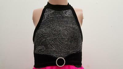 Black Velvet Sparkle bust with Bright pink chiffon skirt, pink trunks attached and a belt with faux buckle