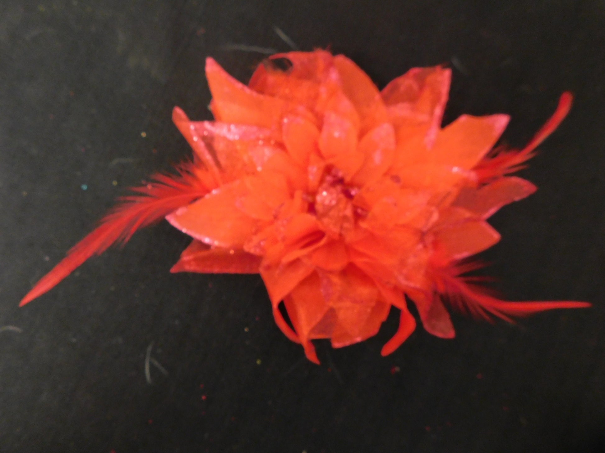 Black and white polka dot dress with ruffle. Edges are bound in red material, with a red flower on the shoulder. Open back with criss crossing red straps. Hair accessory included.