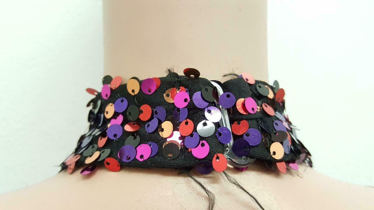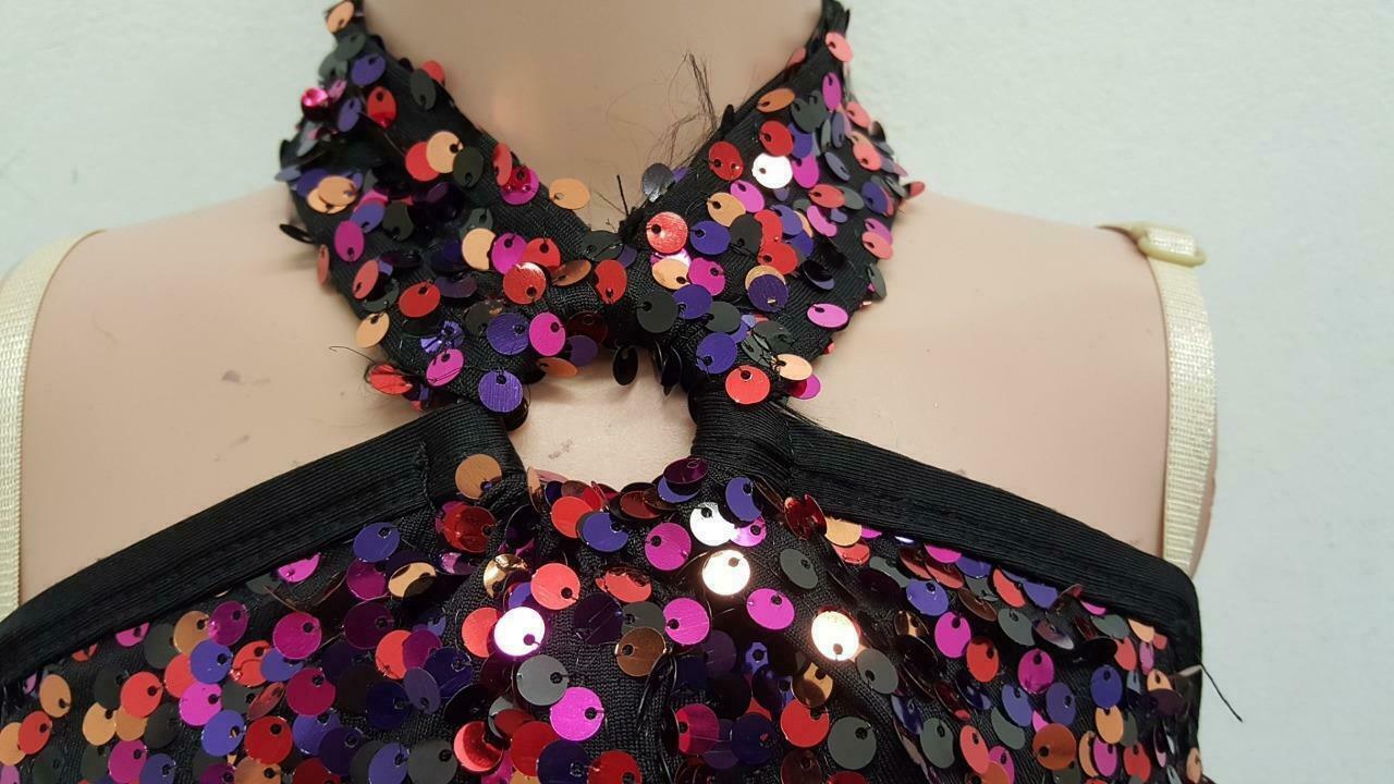 Sequin Leotard with halter neck, and adjustable tan straps,