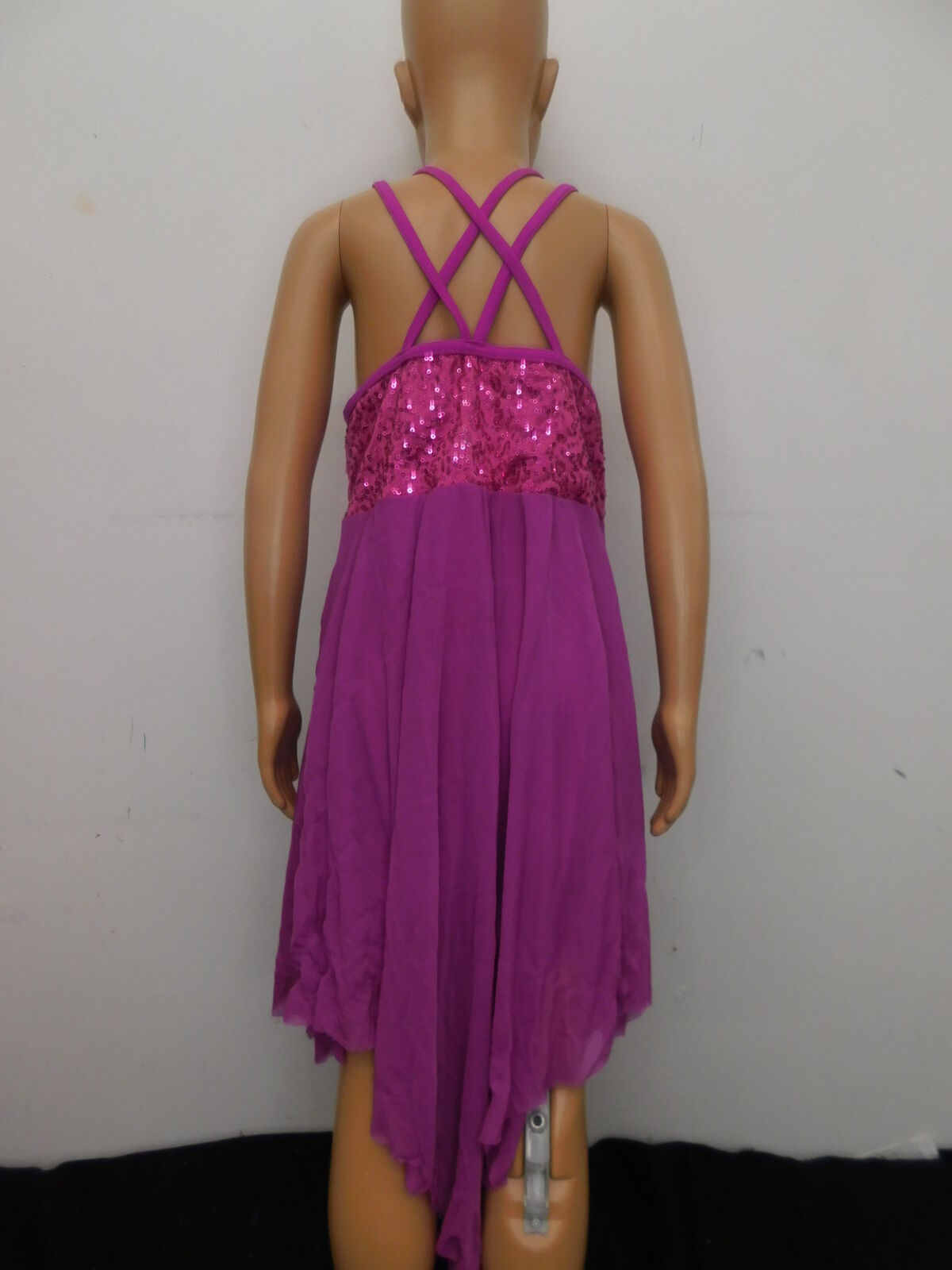 Spandex leotard with attached flowy mesh skirt. top of bodice is sequined and neckline is mesh with straps criss crossing in the back.