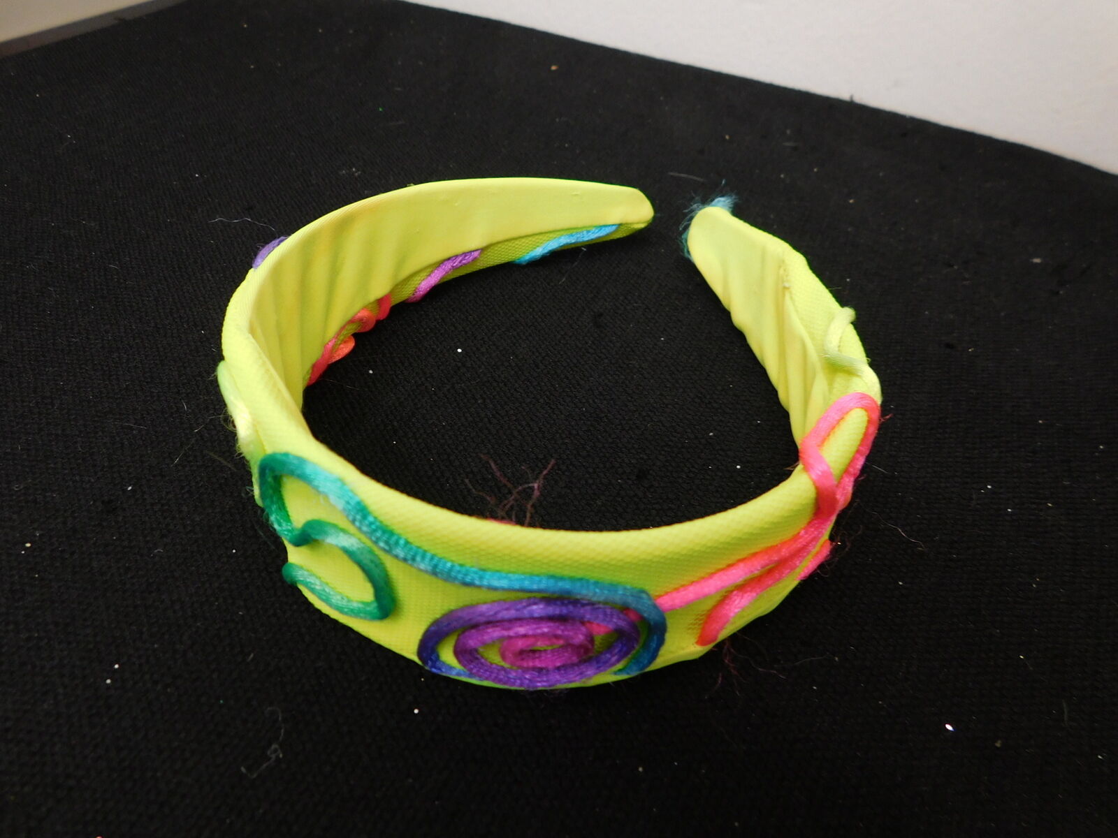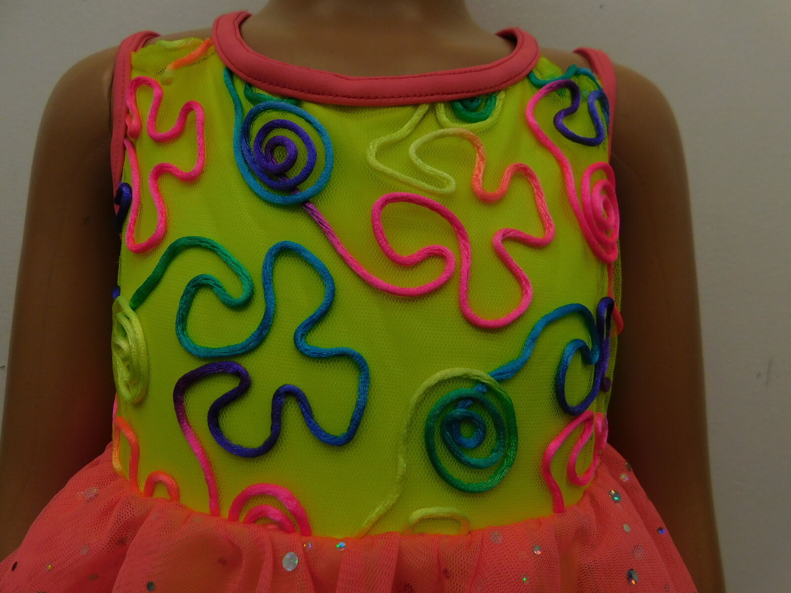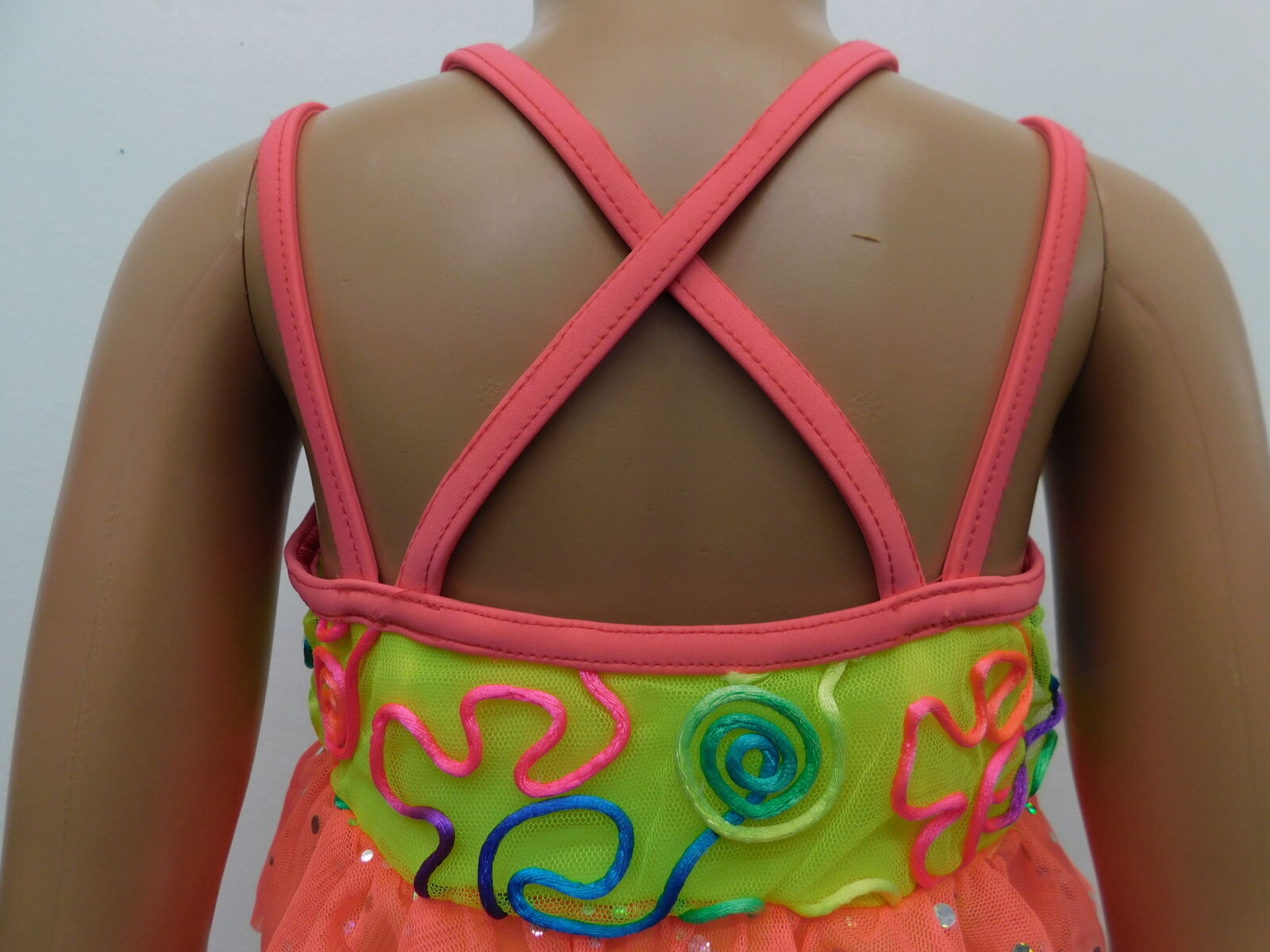 Biketard with attached layers of tulle. Colorful and quirky designs along the bodice. Includes matching headband.