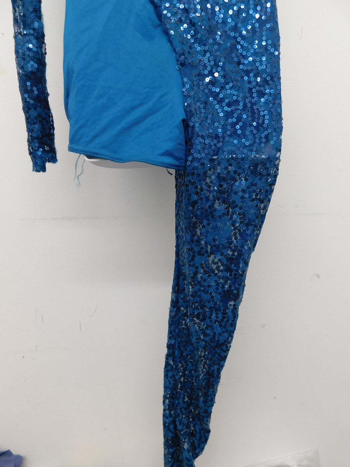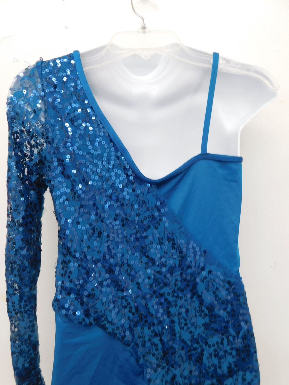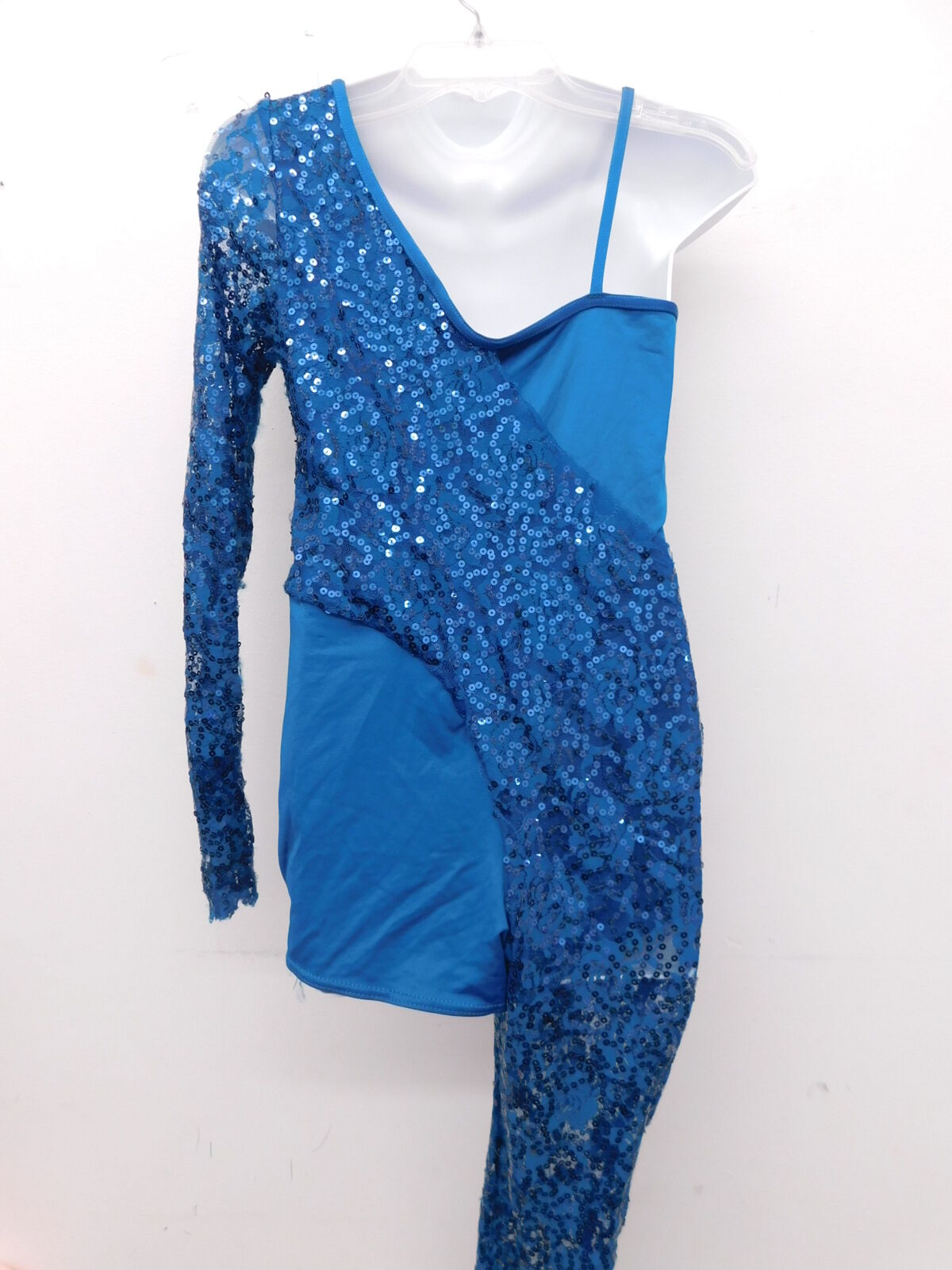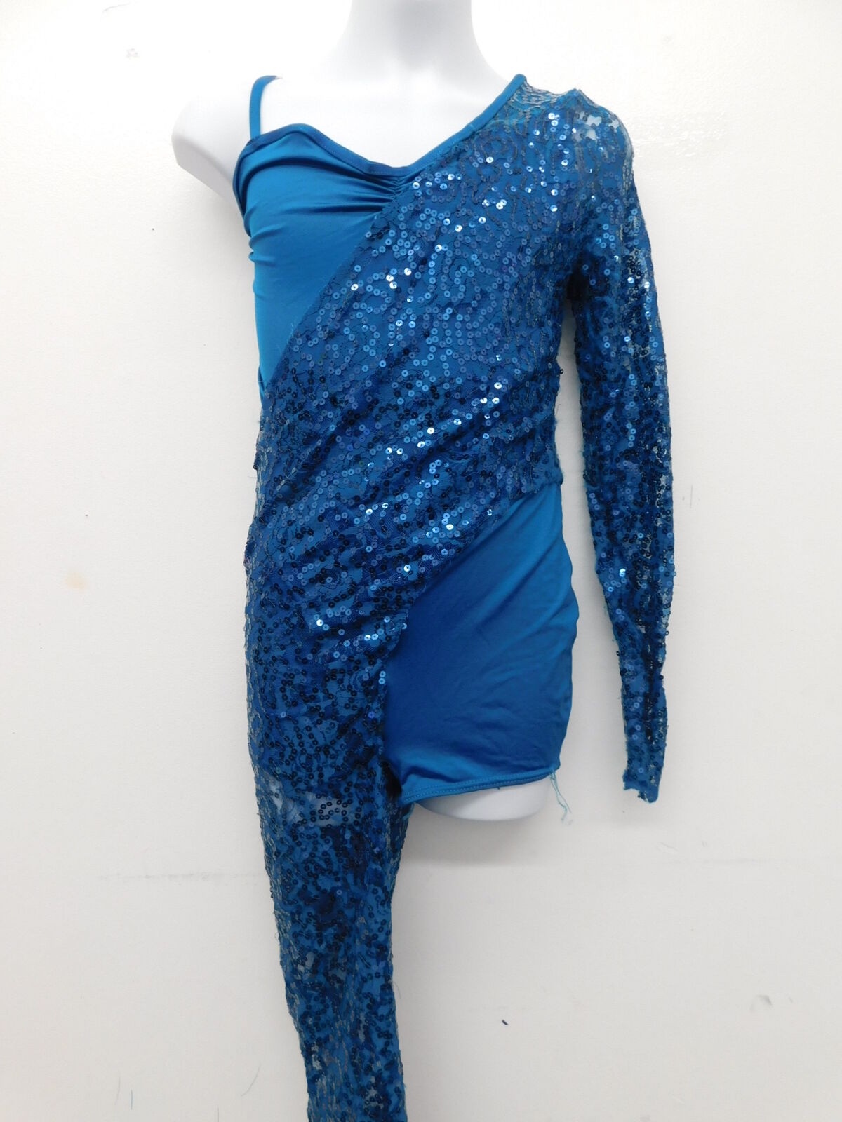 Biketard with sequined lace over lay. Left arm is long sleeve, and right leg is long.