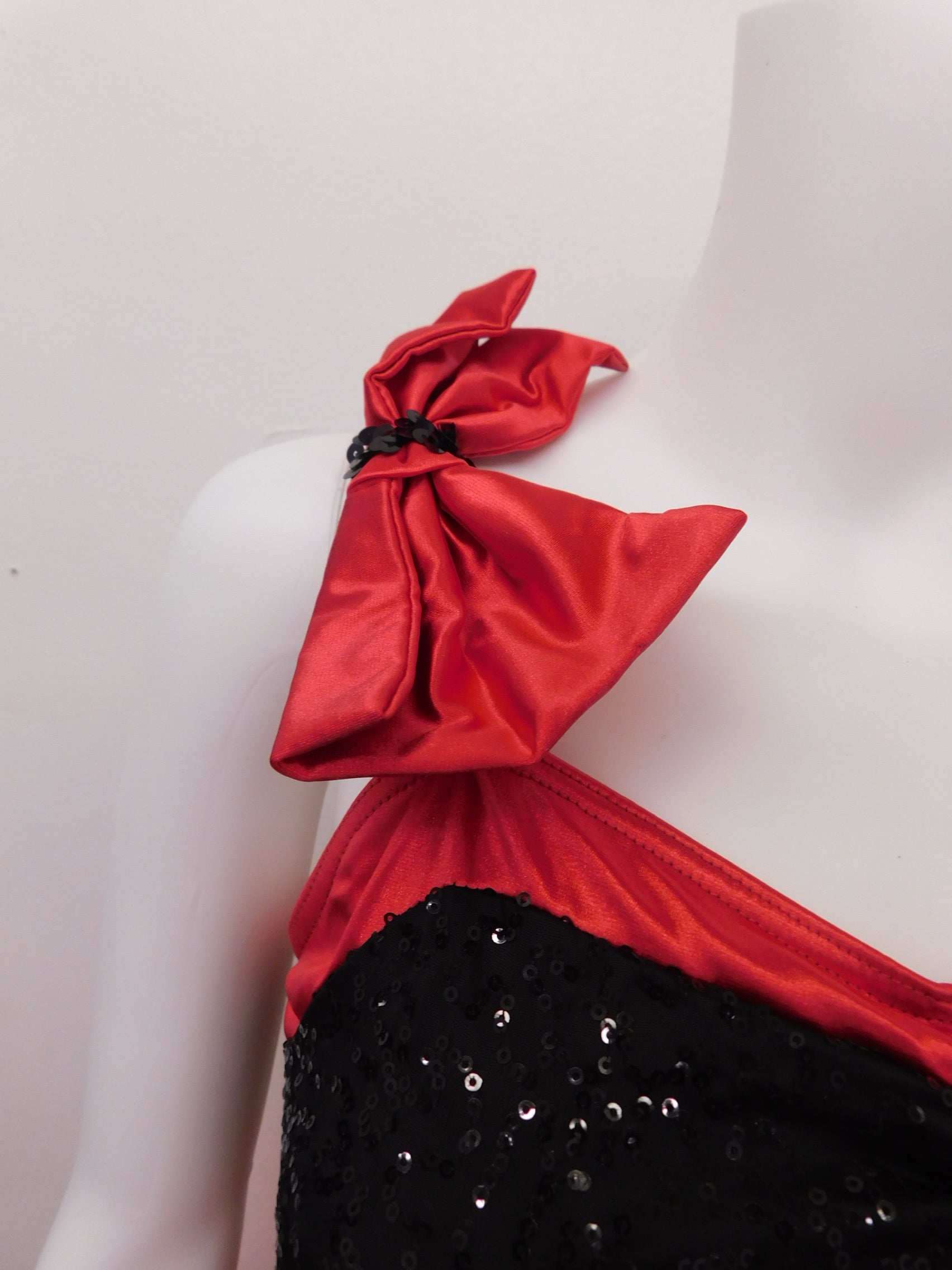 Leotard with sequin bodice red trim bow on one strap attached red stretch satin skirt with under skirt for poof