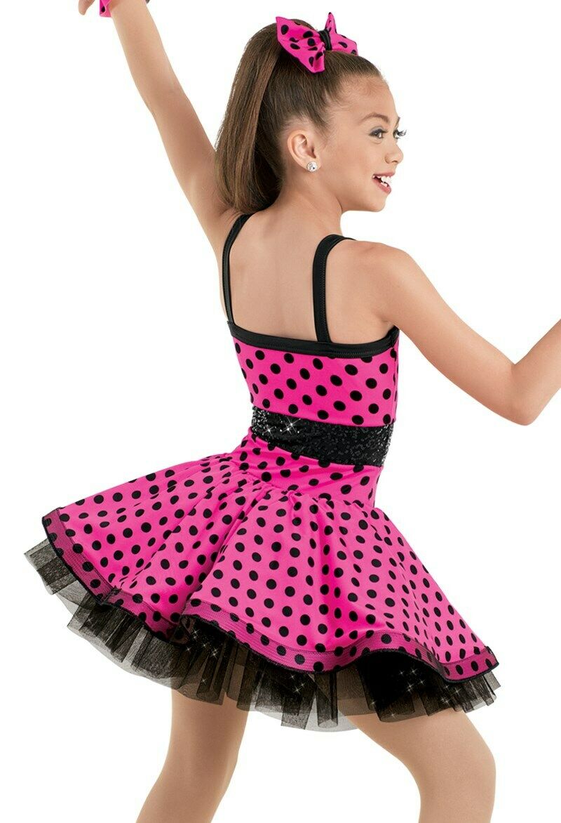 This adorable polka-dot print poly/spandex dress has a sequin-spandex waist inset, crinoline-trimmed hem and glitter-tulle underskirt. Matte nylon/spandex briefs attached. Imported.
