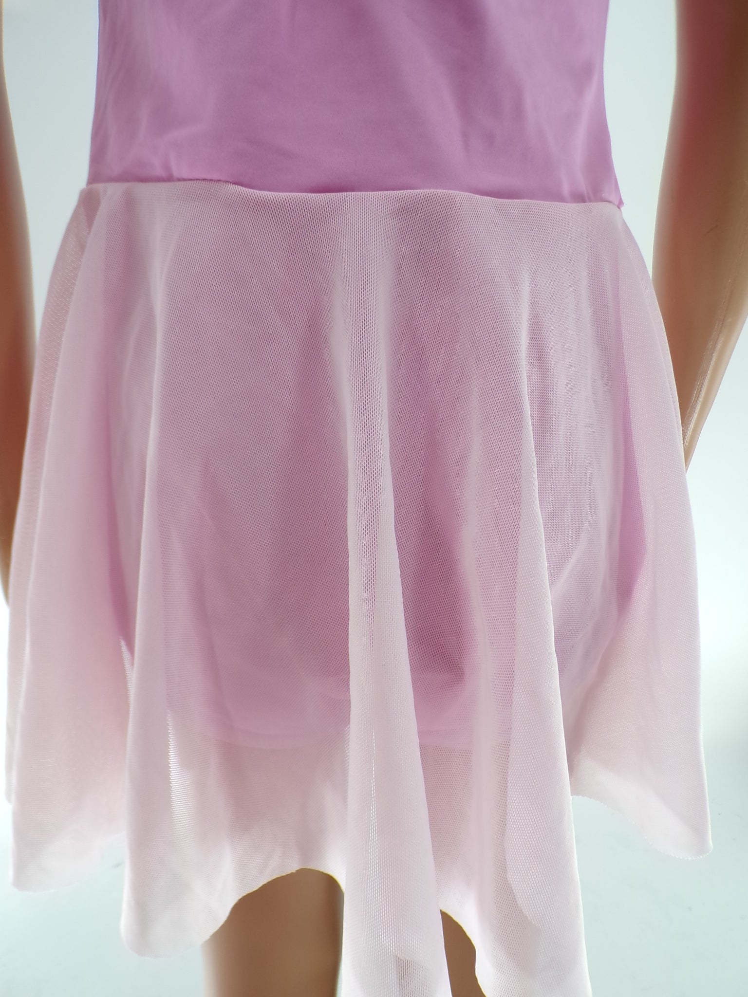 Attached power mesh skirt has angled front and back panels