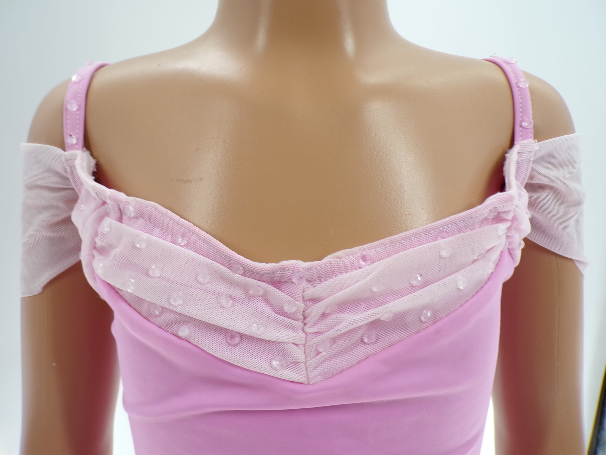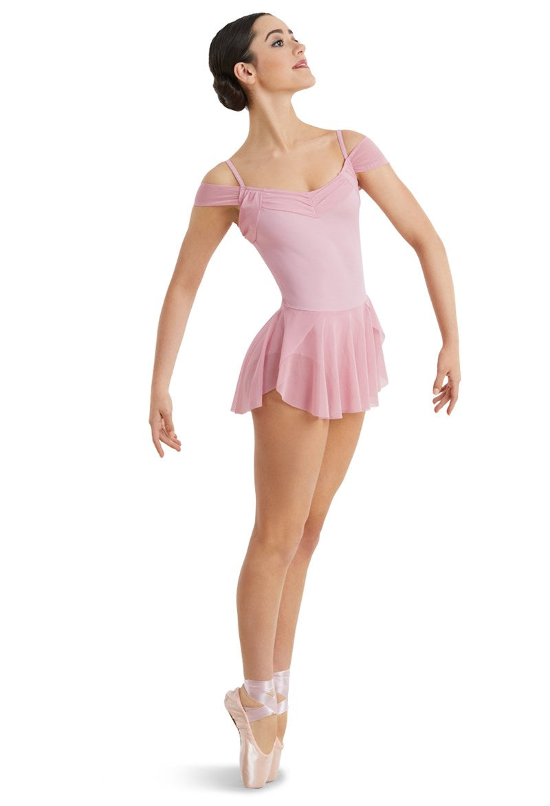 Matte nylon/spandex leotard with power mesh neckline and off-the-shoulder sleeves