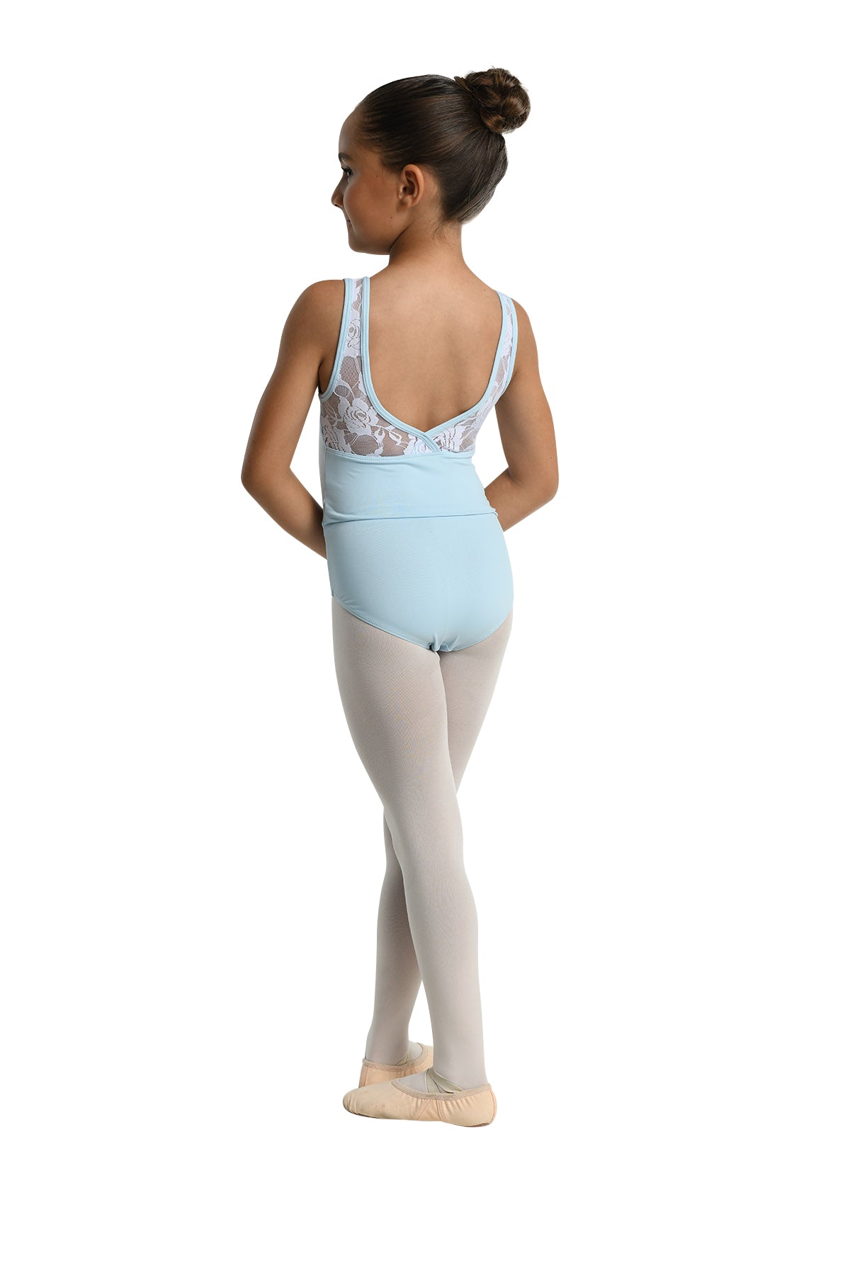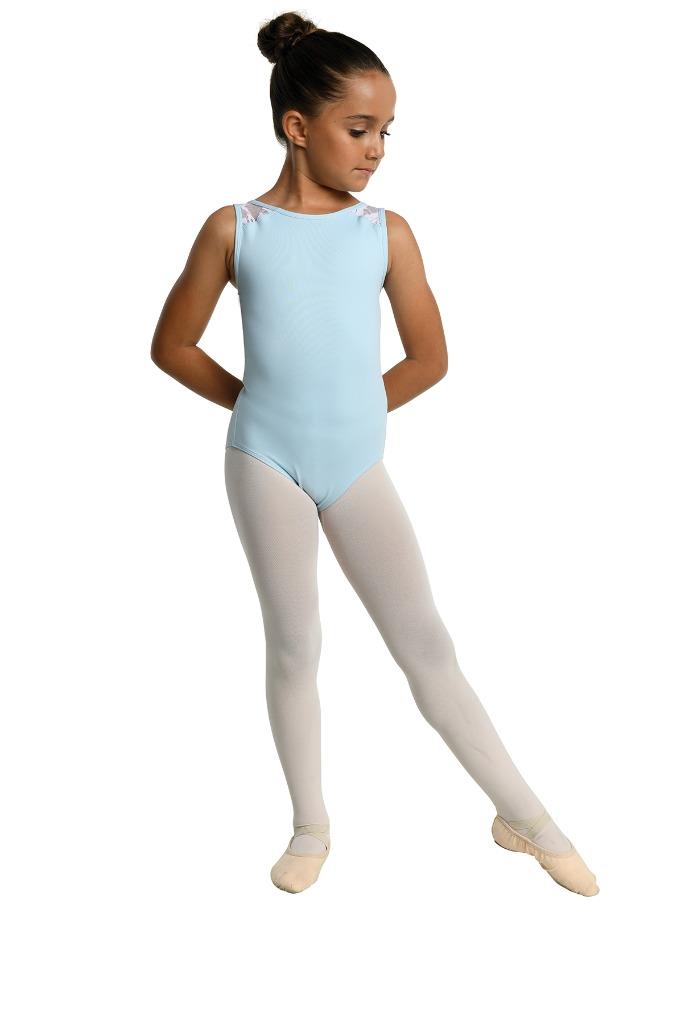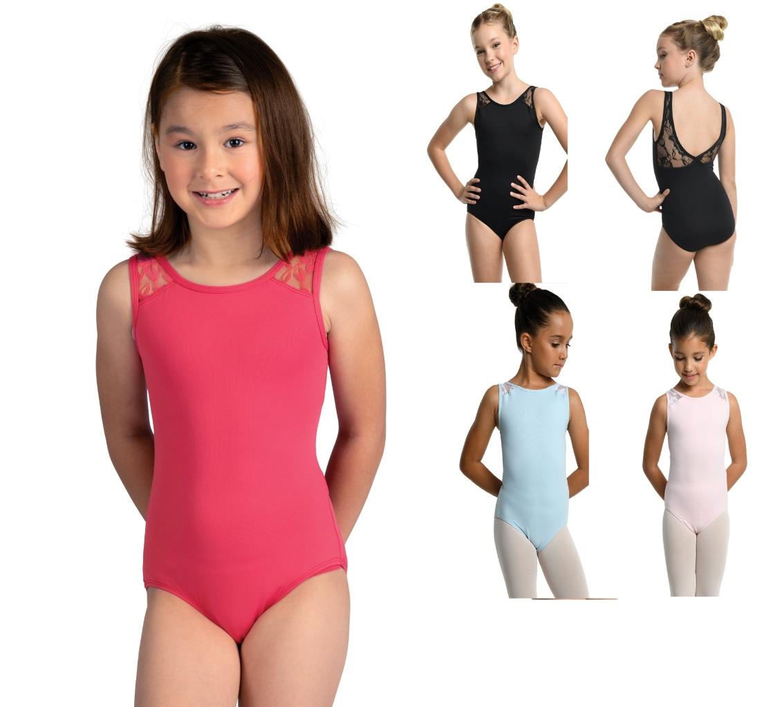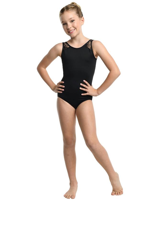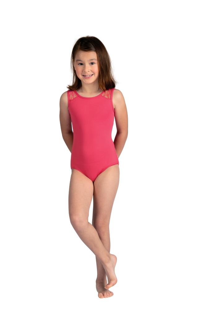 23108C - CLEMENTINE LEOTARD Tank leotard with V-back styling. Floral motif lace at shoulders and back panels. Fully front lined. Nylon/Spandex. Pink and Light Blue leotards have White lace. Black and Berry leotards have tonal (matching) lace.
