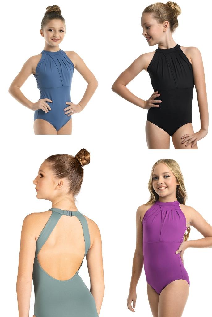 23112C - ADELE LEOTARD Part of the Twist Group, this halter style leotard with pleated detail at front bodice and a styled keyhole back with latch closure. Full Front Lining. Nylon/Spandex.