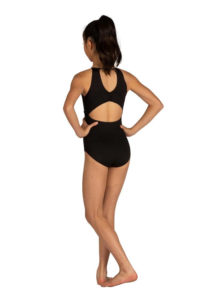 24106C - DONATELLA LEOTARD Halter cut leotard with front and back keyhole and shirring details. Latch closure at back neck. Girls fully front lined. Nylon/Spandex.