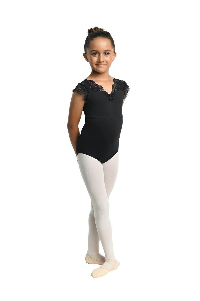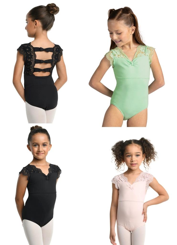 23104C - BRIE LEOTARD - Cap sleeve V-neck leotard featuring scalloped lace at yoke, sleeves, and back panels. Sweetheart neck detail with pinch front and triple bow detailing at back. Fully front lined. Nylon/Spandex.