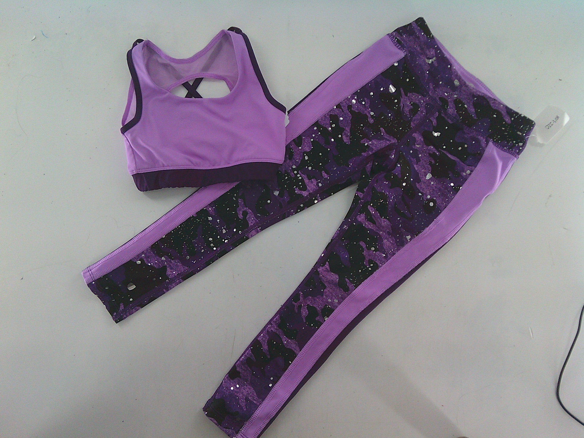 Leggings with Purple Camo print and matching Sports Bra