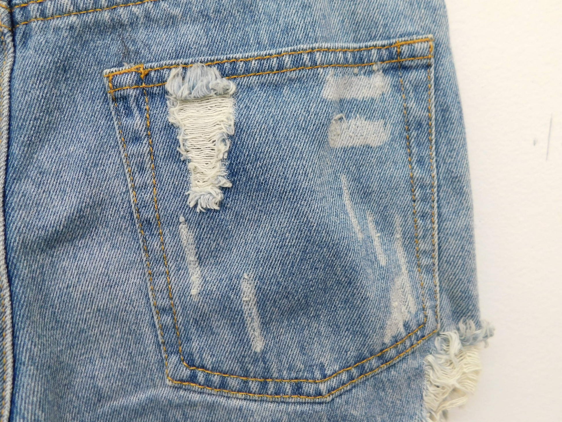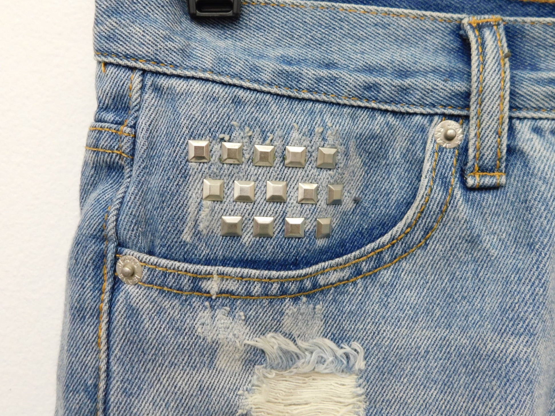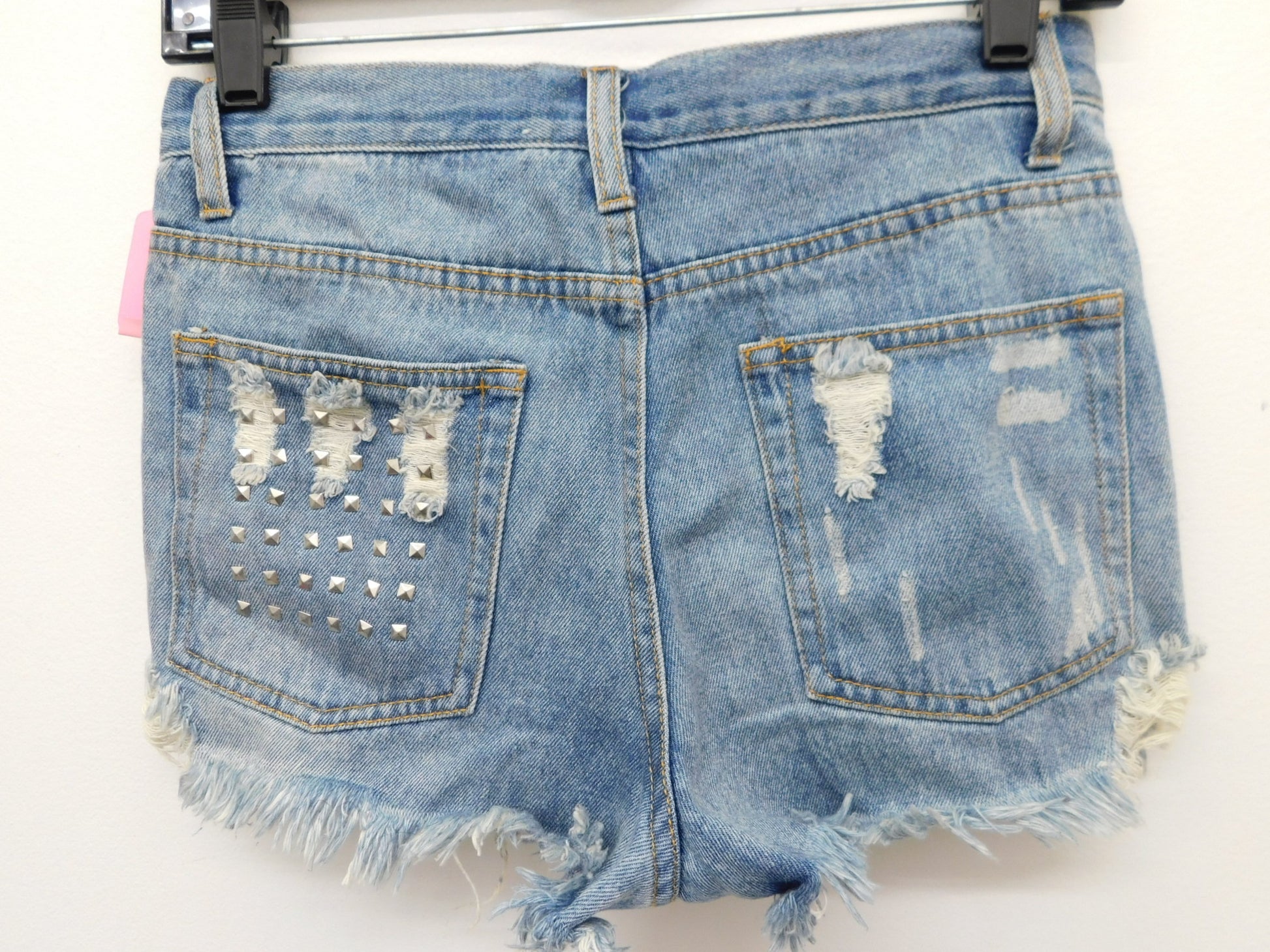 Light Denim ripped shorts with studded pockets and distressed bottom