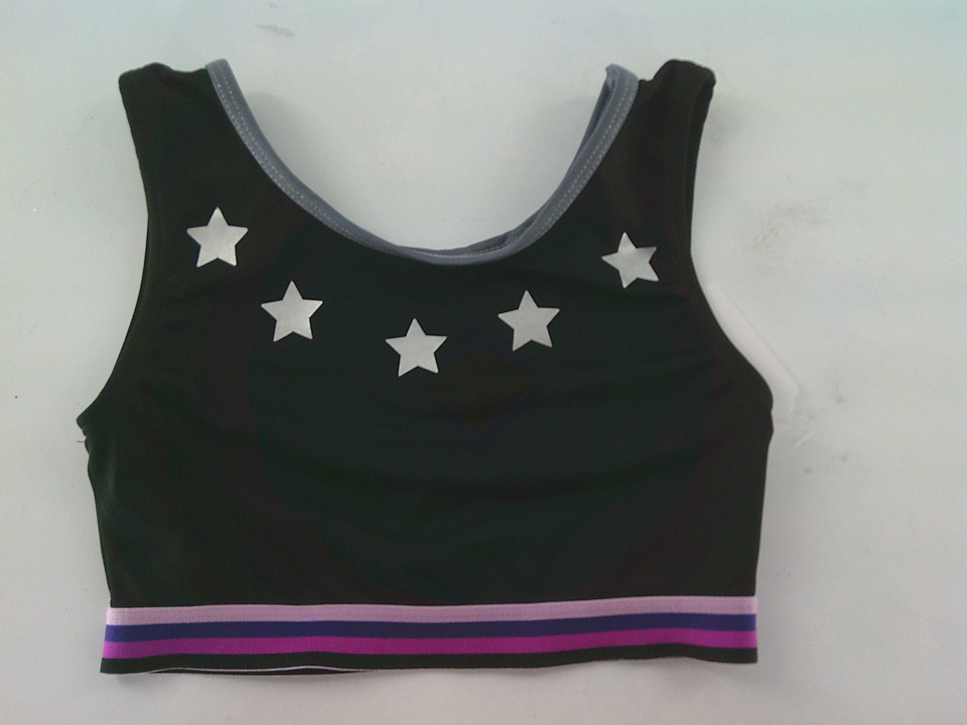 Black Sports bra with pink purple band and gray trim with stars on the chest