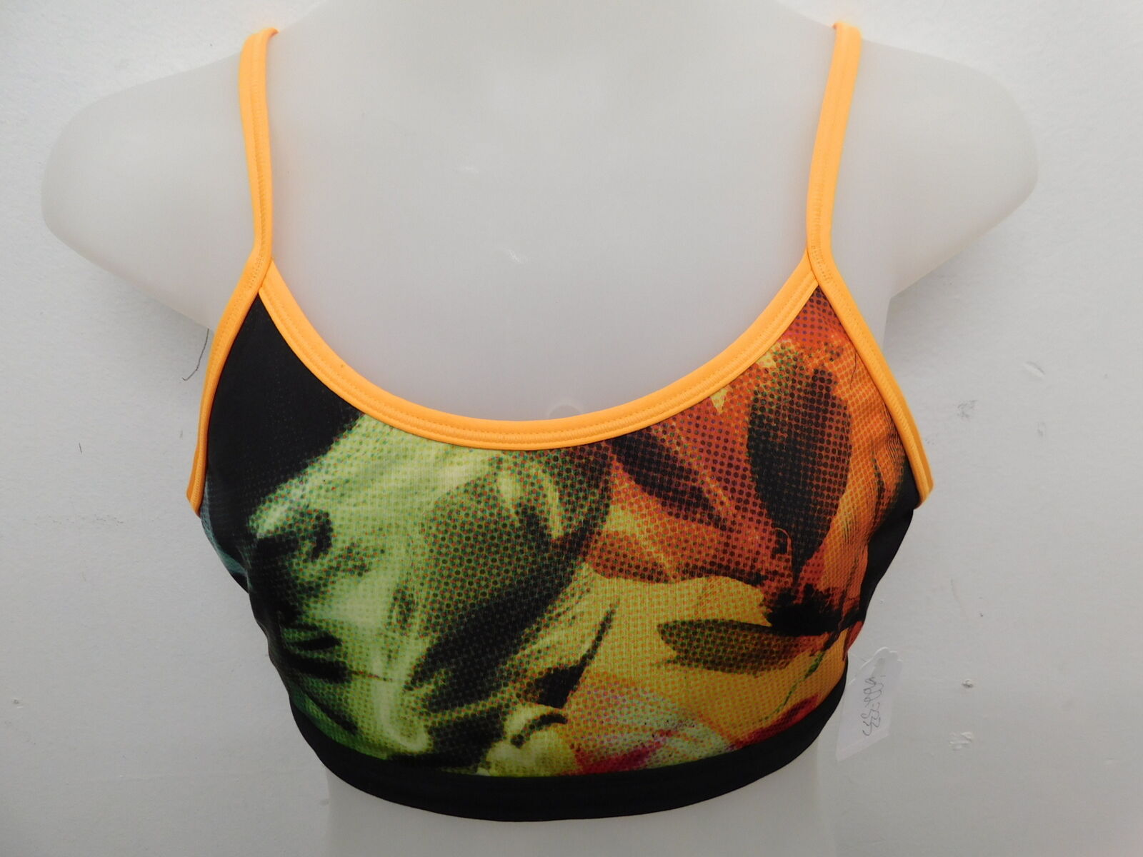 Dance Bra with orange neon straps and beach image across the front of the bra with straps across the back