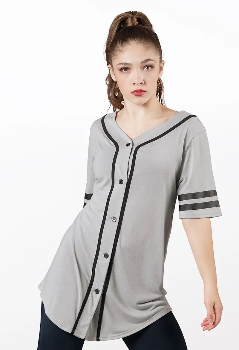 Features: Stripe Short Sleeve Cotton Description: A modern take on the classic baseball jersey with short sleeves and contrast stripe details. Front button closure allows for versatile open or closed styling options. Bra top not included. Imported. Does NOT include the bandanna head piece Fabric : Polyester/Rayon.