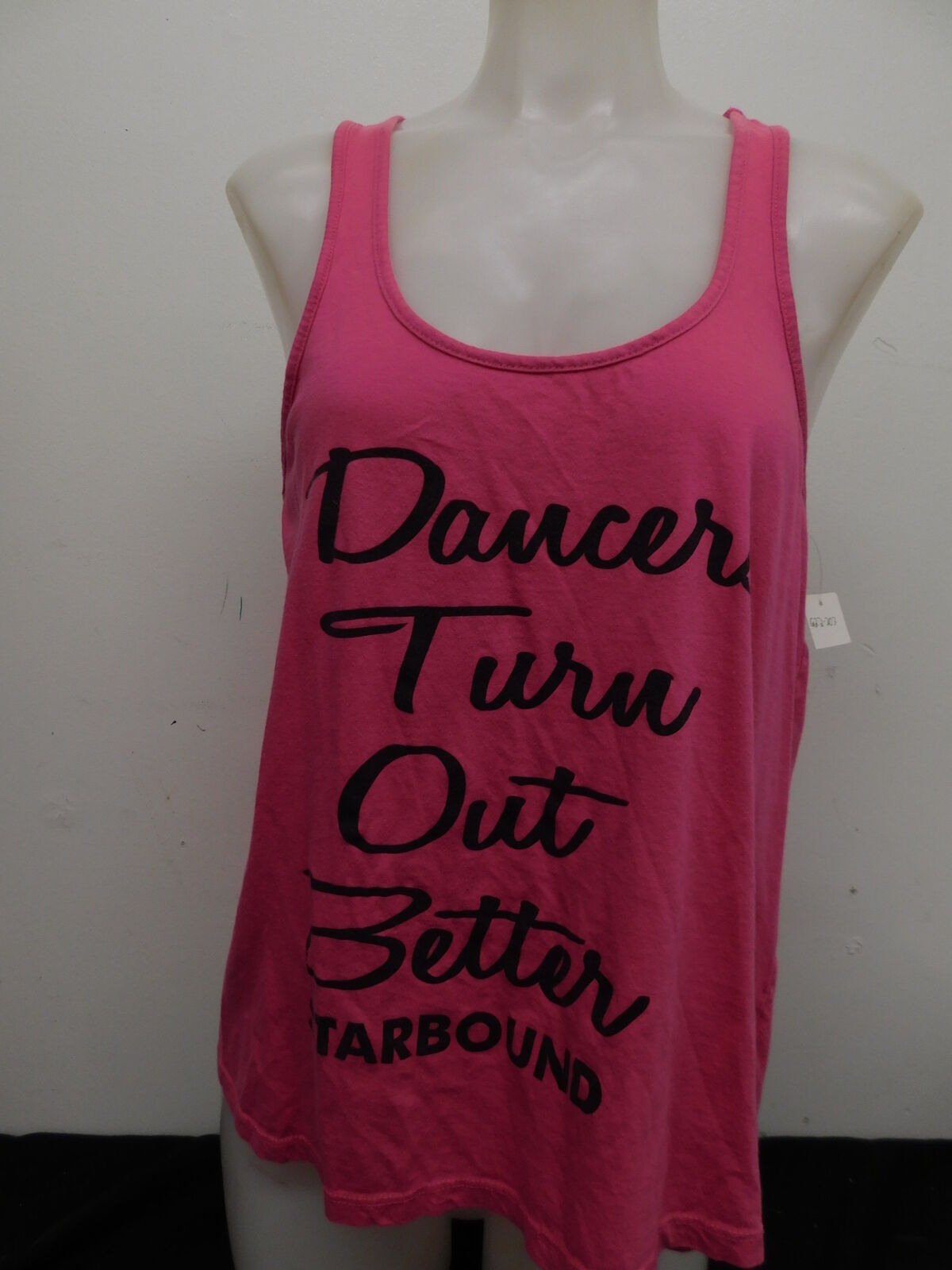 Pink Racer Back Dance Top with "Dancers Turn Out Better Starbound" Written in Black on the front of the shirt