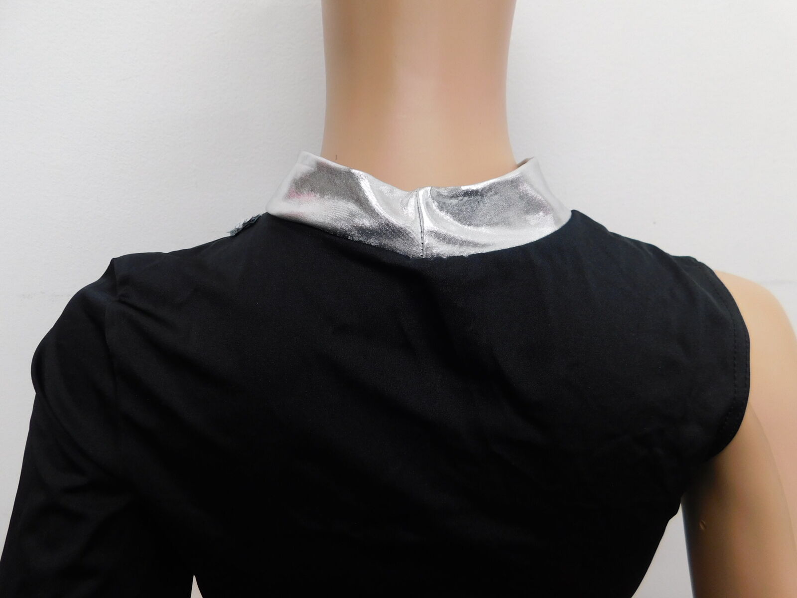 Black one sleeve top with silver color and sequins across the chest