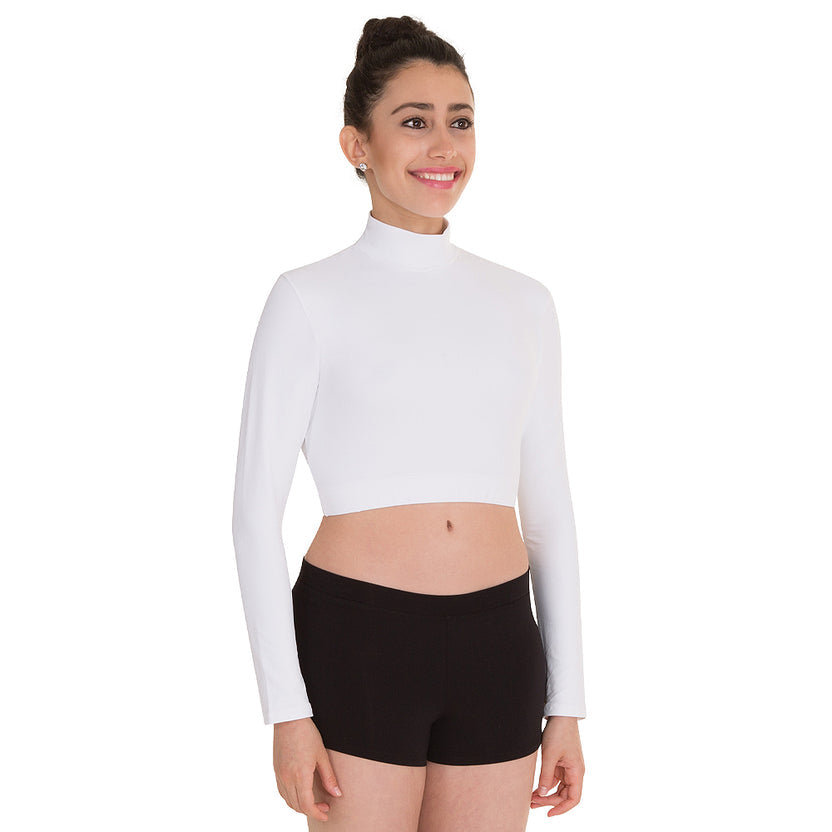 Long sleeve turtleneck midriff pullover features a zipper back and an elastic bottom for a secure fit.