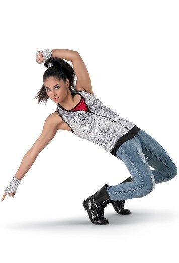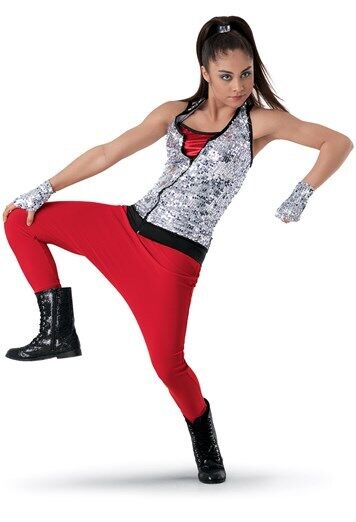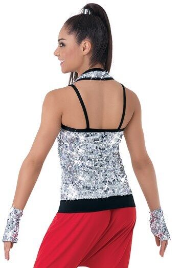 A silver Ultra Sparkle sequin, zip-front vest is the main act of this urban chic costume. A red premium metallic bra top peaks through for a dash of color. Customize your look with optional urban pants.