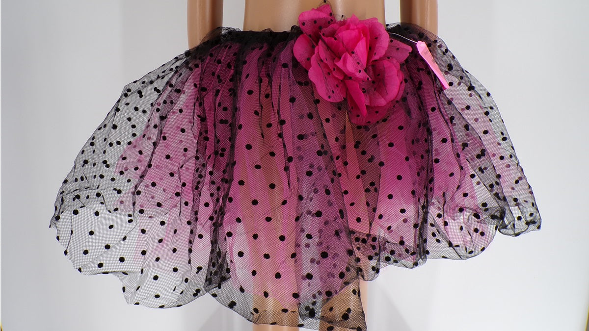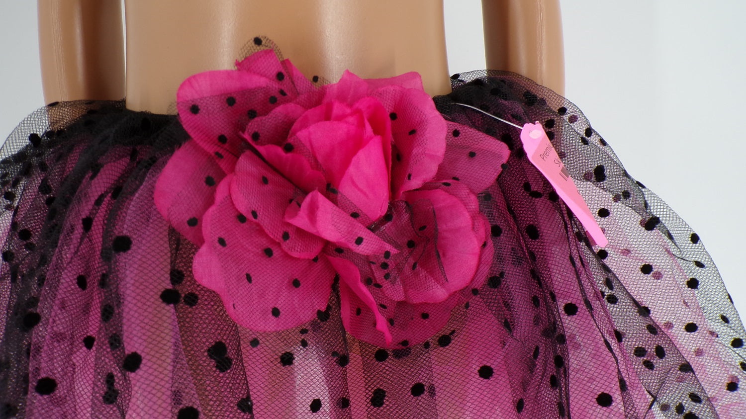 Pull-on tutu with attached Flower and black polka dot overlay.