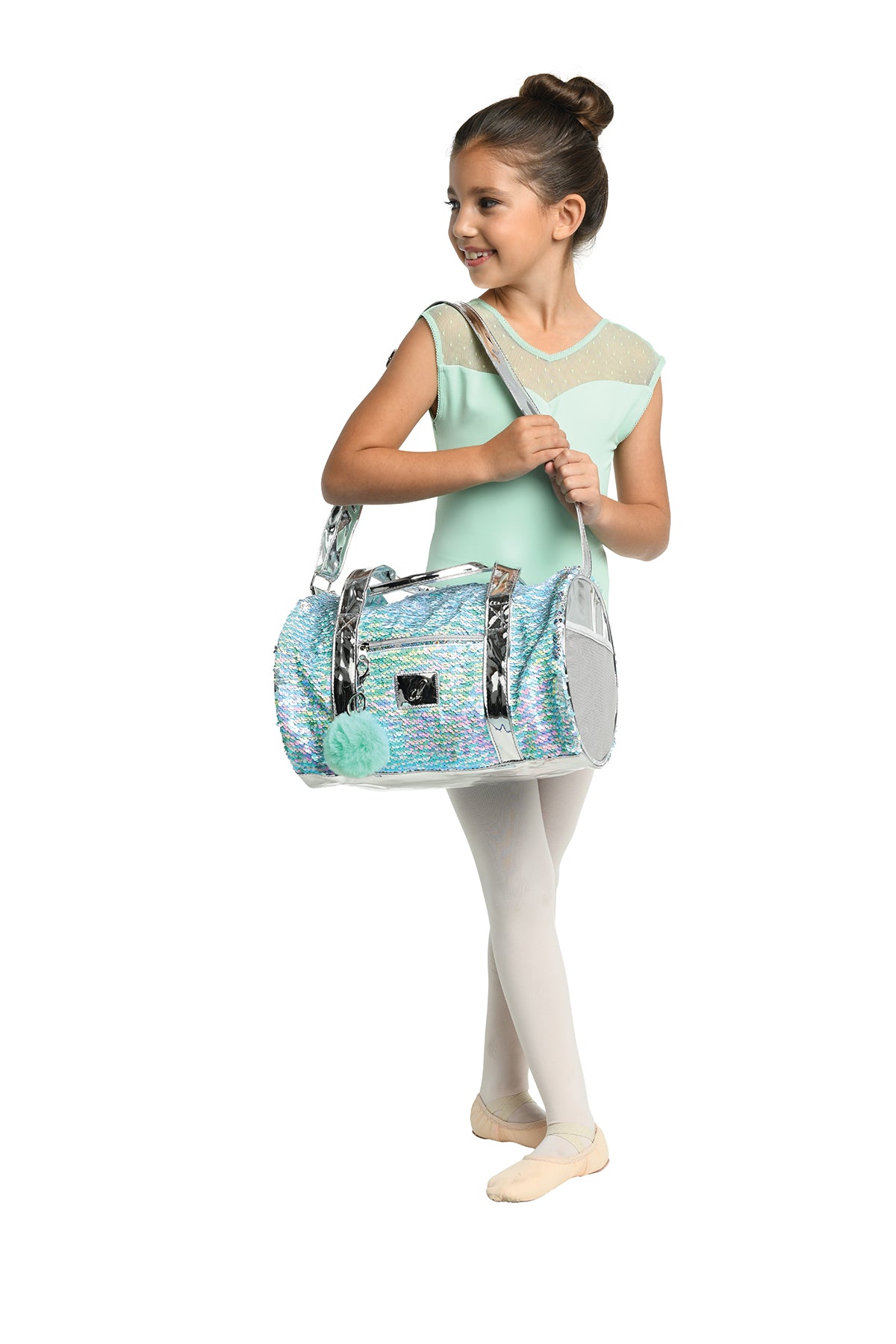 This reversible sequin bag turns from green to silver with the flick of your finger and has a large inside compartment to hold all your dancing gear. The silver metallic handles and bag sides glimmer along with our "d" front logo. Included are two side mesh pockets and a front zipper pocket along with custom "d" zipper pulls and a cute green poof! Double carrying handles and an adjustable shoulder strap complete this bag. This bag is fully lined, wipes clean, zips closed and folds flat.