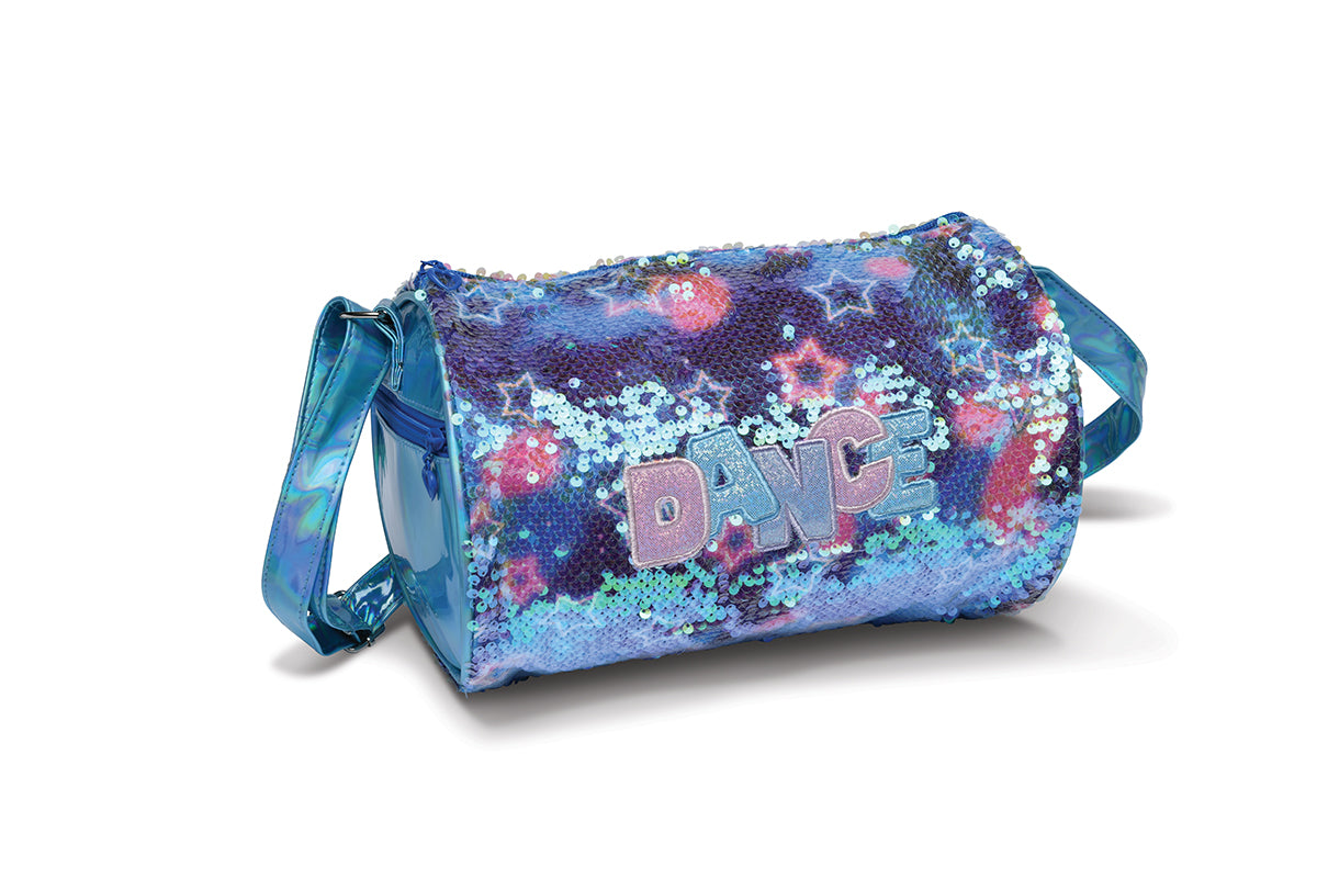 Wow! This super cute sparkly sequin bag will be on every kid's wish list. This dance duffel features a vibrant colorful sequin outer fabrication highlighted with stars and the word DANCE in glittery pink and blue letters. The two bag ends and adjustable carrying handle/shoulder strap are made from a holographic material, one side includes a zipper pocket. The inside compartment is fully lined, zips closed, wipes clean and folds flat.