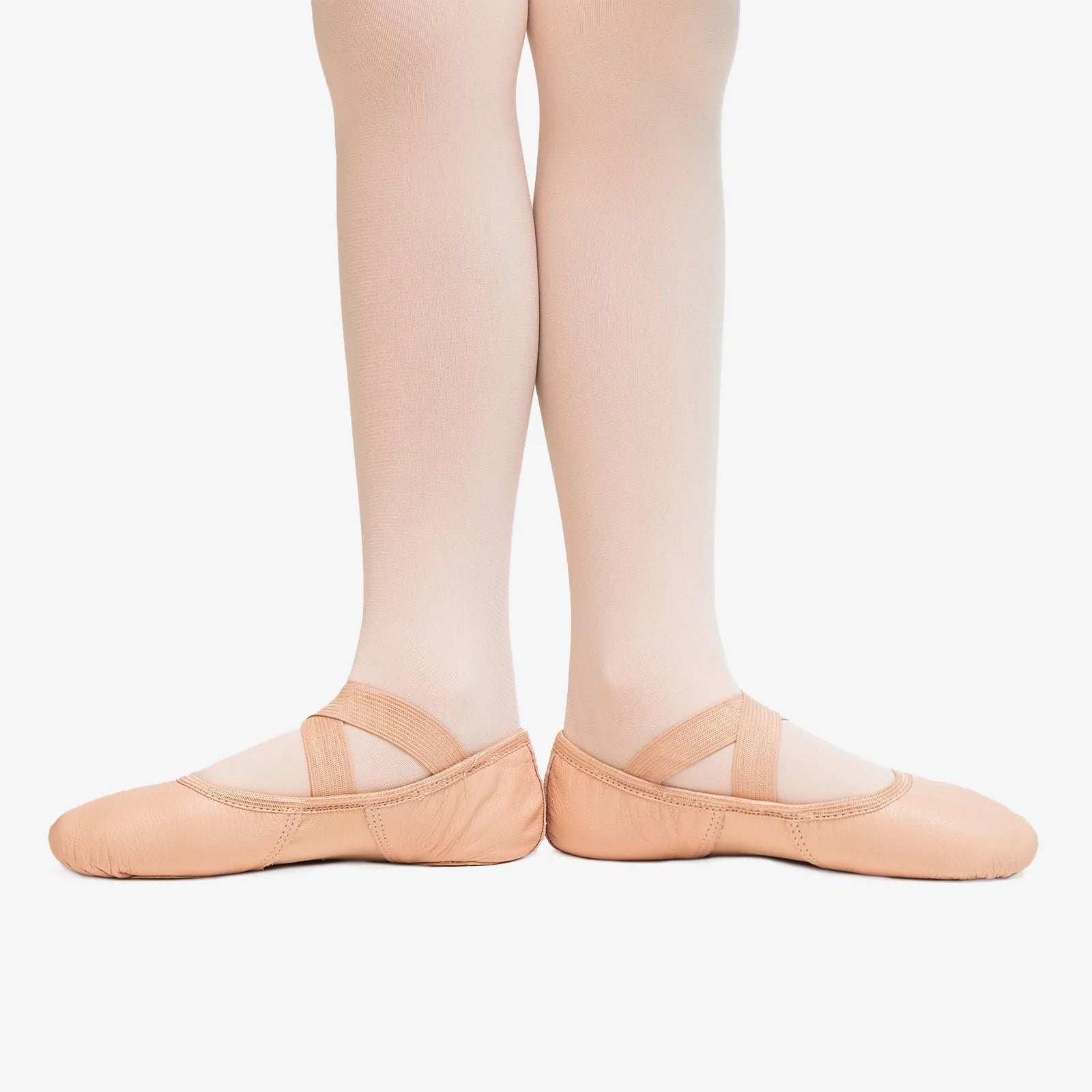 Style SD110S superpro by So Danca. Fully elasticized leather ballet shoe. Amazing adherence to the foot with nylon spandex insert under the arch, contouring the arch and toes perfectly. A single, reinforced seam down the centre lays flat against the foot, creating a sculpted fit with absolutely no bulk of excess material at the arch. Elastic binding replaces both drawstring and casing.