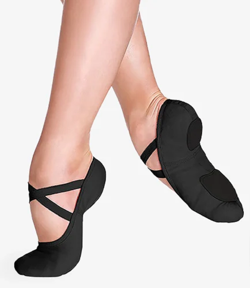 Soft stretch canvas upper with nylon spandex arch insert. Elastic binding eliminates need for drawstring. Pre-sewn elastic over instep. Split sole construction. Packaged in a sturdy plastic bag for storage conservation.