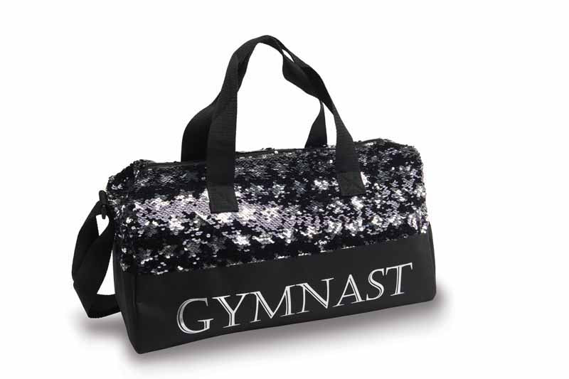 Black and silver sequins decorate the front of this bag along with the word "GYMNAST" in silver metallic letters. Large fully lined inner compartment with zipper closure to hold all your dance gear. Double handles plus adjustable shoulder strap offers flexibility in carrying.
