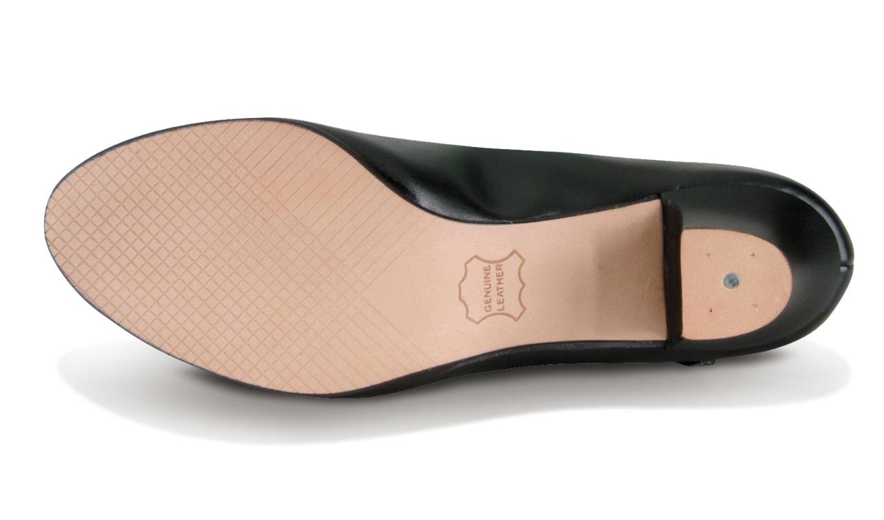 Leather soles, with ankle strap and imitation leather uppers. 1-1/2" Baby Louis heel, cushioned sock liner. Taps not included.