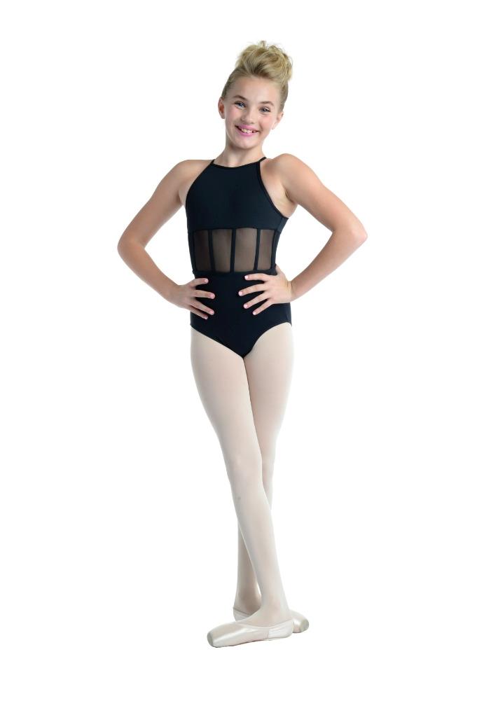 Our beautiful "Brigitte" halter style leotard offers a flattering neckline, sheer midriff with corset-style detailing and a tear drop back with a clasp closure behind the neck. This leotard is competition ready! Shelf bra with removable cups. Nylon/Spandex