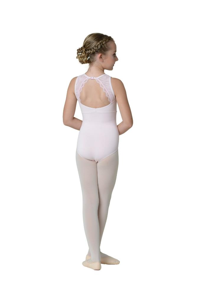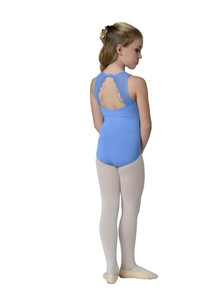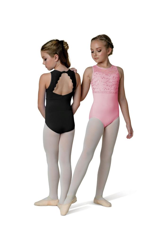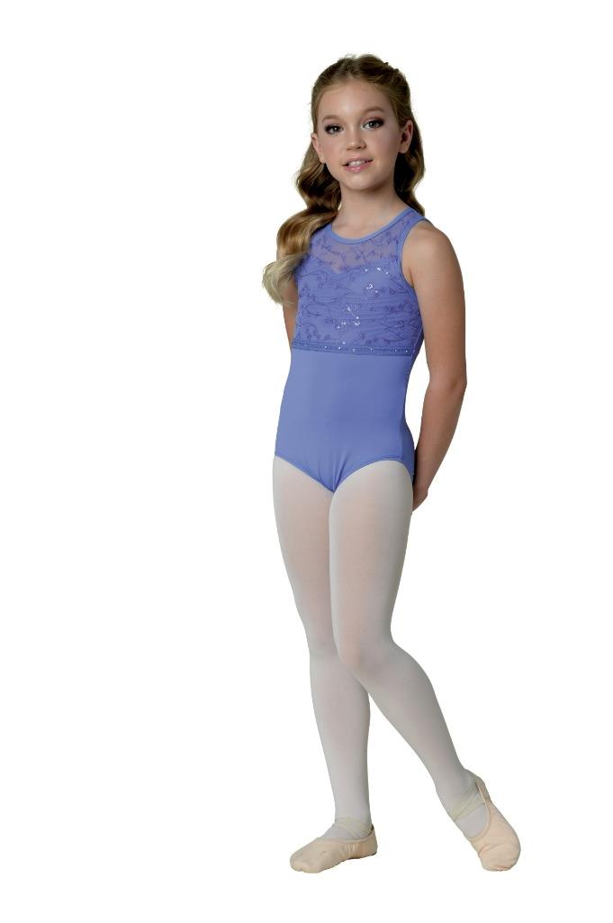 22102C - BELLA LEOTARD Cutaway tank leotard with sequin embroidered mesh yoke overlay and rhinestone trim at seam. Scalloped lace trim frames the back opening. Fully front lined. Nylon/Spandex