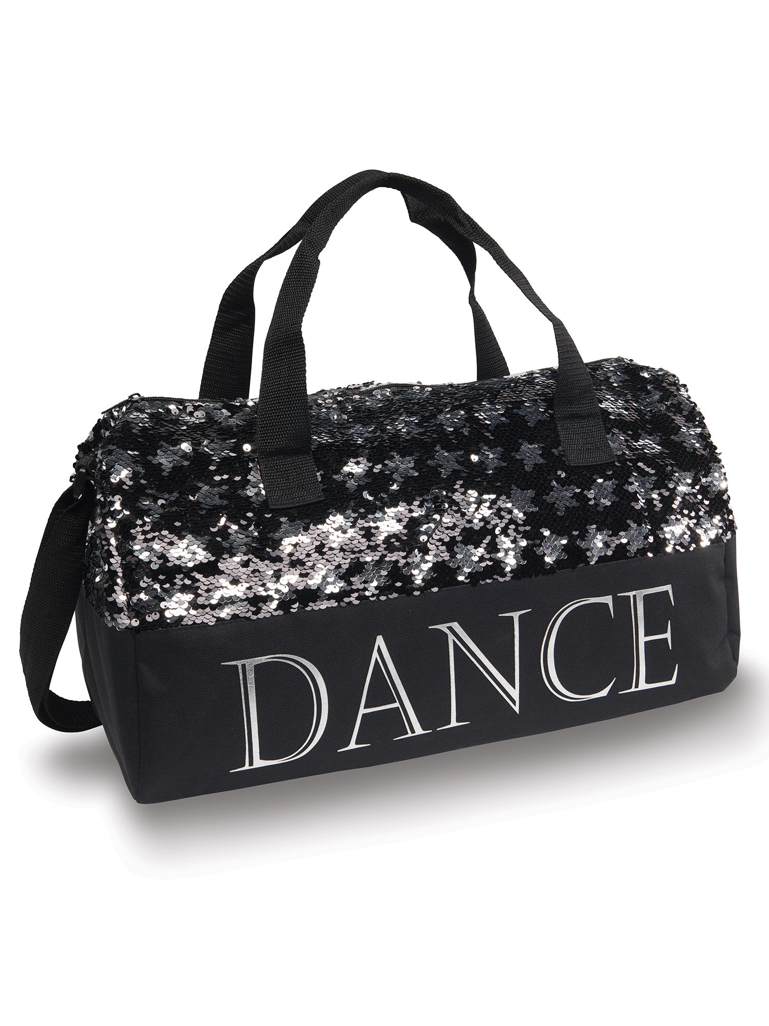 Black and silver star pattern sequins decorate the front of this bag along with the word "DANCE" in silver metallic letters. Large fully lined inner compartment with zipper closure to hold all your gear. Double handles plus adjustable shoulder strap offers flexibility in carrying. Made from durable nylon fabric that is easy to wipe clean. Lightweight and folds flat.