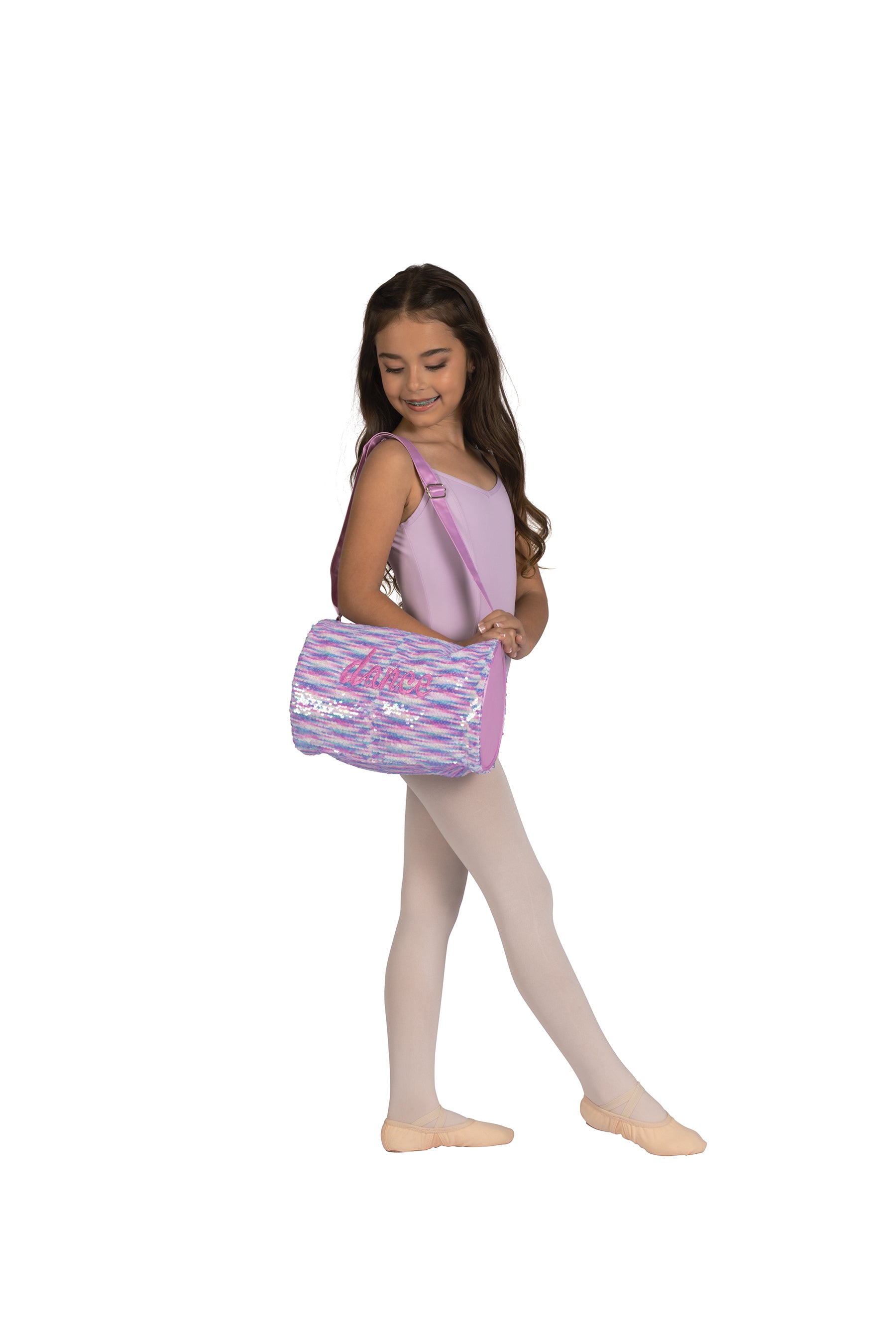 Shine bright with this cute pastel sequin dance bag. Includes fully lined inside compartment with zipper closure top. The sequin exterior includes the word dance embroider front and center along with a fun key chain poof and soft adjustable shoulder strap or carrying handle. Wipes clean and folds flat.