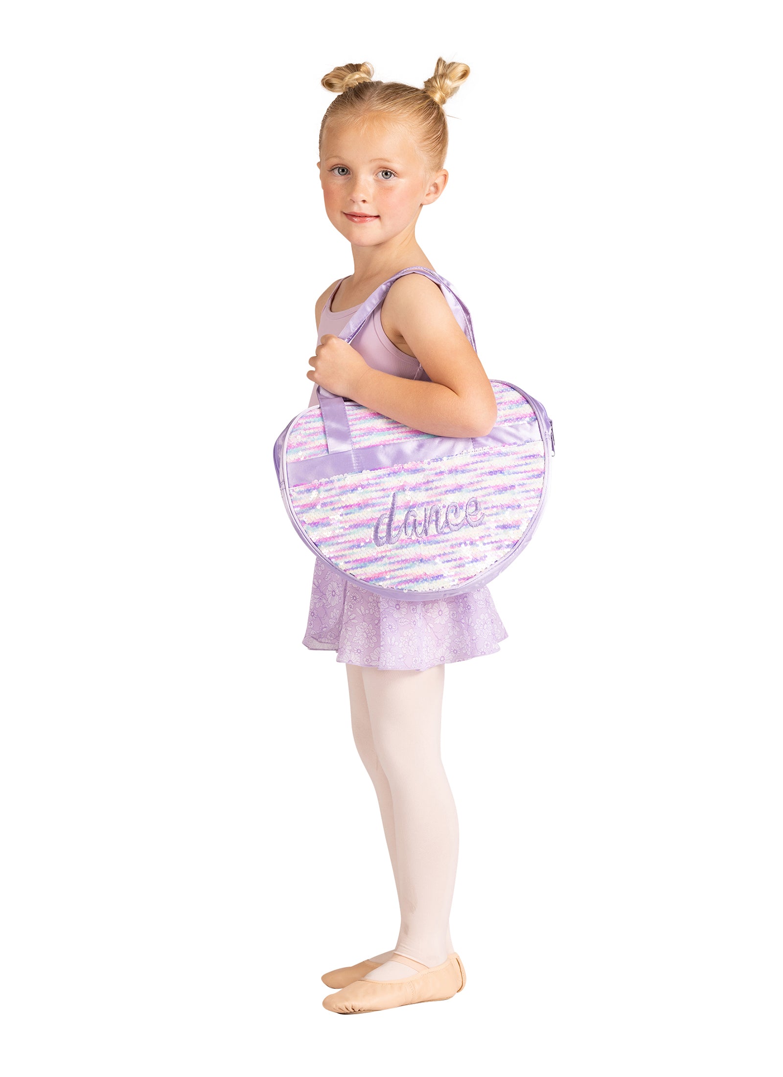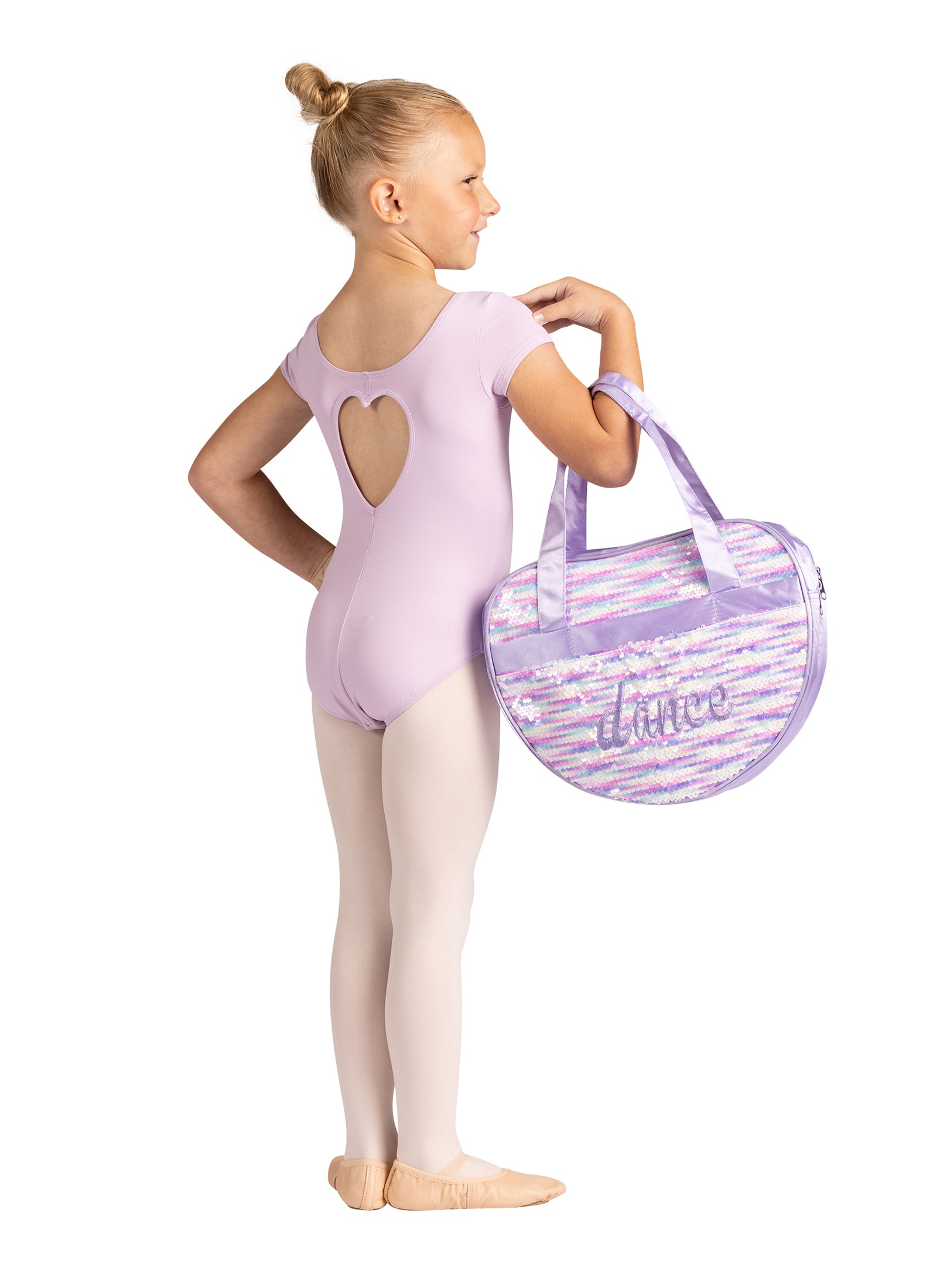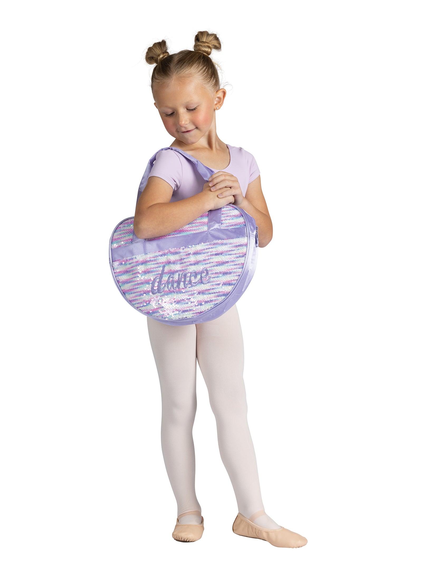 Adorable lavender shimmering sequined heart tote, the sweetest dance bag for any young dancer. The word dance is embroidered front and center. A full zipper top, double handles and 2 exterior pockets, front and back, complete this cute tote. This bag wipes clean and folds flat.